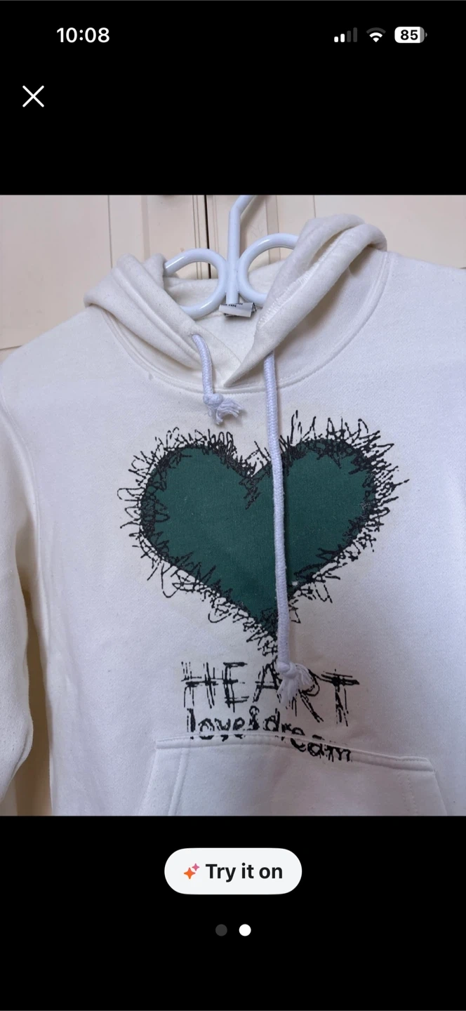 White hoodie with a unique green heart graphic and text that reads "HEART love&dream". It features a front kangaroo pocket and adjustable drawstring hood. Cotton blend material. Classic fit.