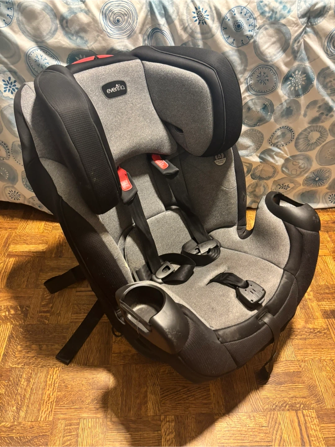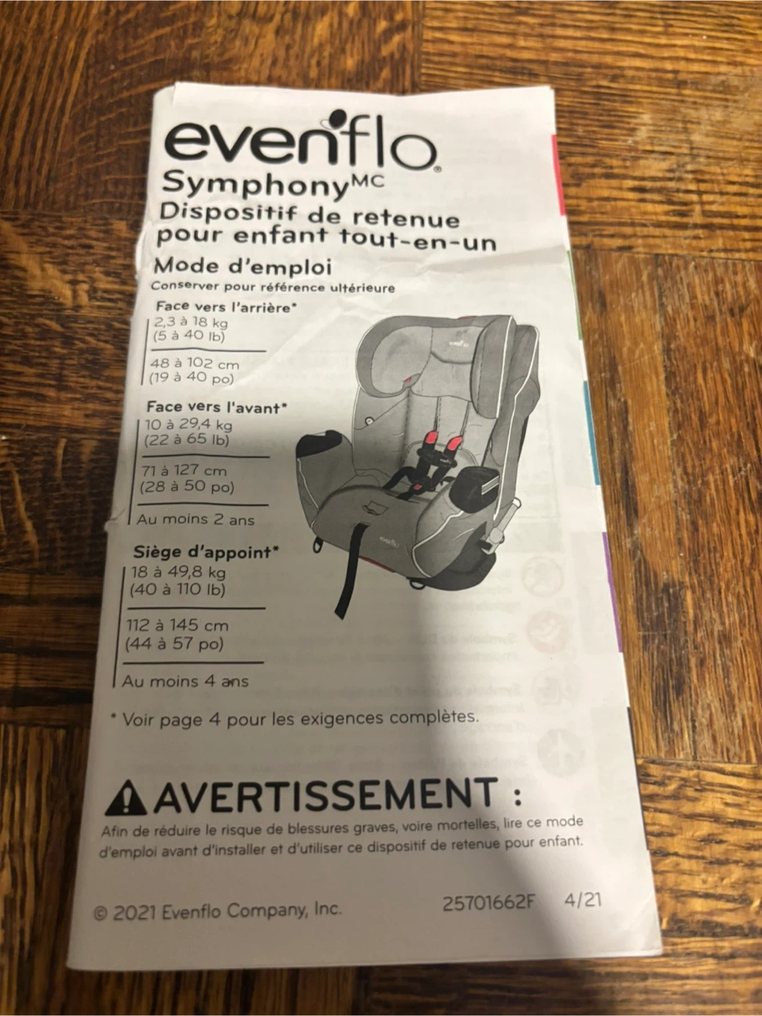 Evenflo Symphony all-in-one car seat. Suitable for children from 5 to 110 lbs. It's designed for rear-facing, forward-facing, and belt-positioning booster modes. The car seat has adjustable harness positions for a custom fit. Purchased in 2021.