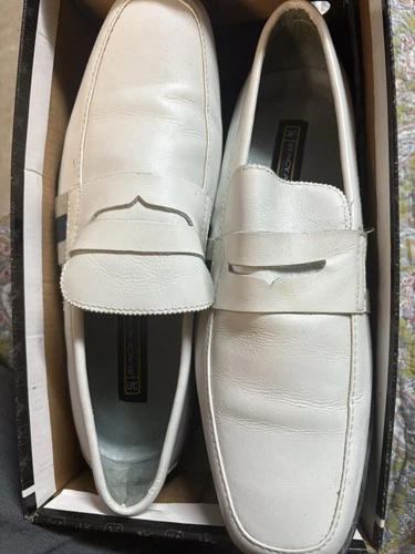 Stylish and sophisticated white leather slip-on loafers for men. High-quality leather with a comfortable leather lining and insole. Classic design, versatile for many occasions. Ideal for summer, fall, and spring. Signs of wear.