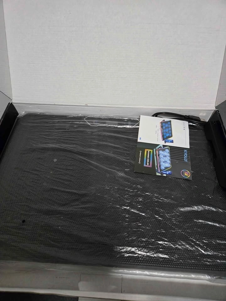 Gaming laptop cooler stand with 6 quiet fans, adjustable height (9 settings), LED lights, LCD screen, and 2 USB ports. Can also be used as a lap desk.