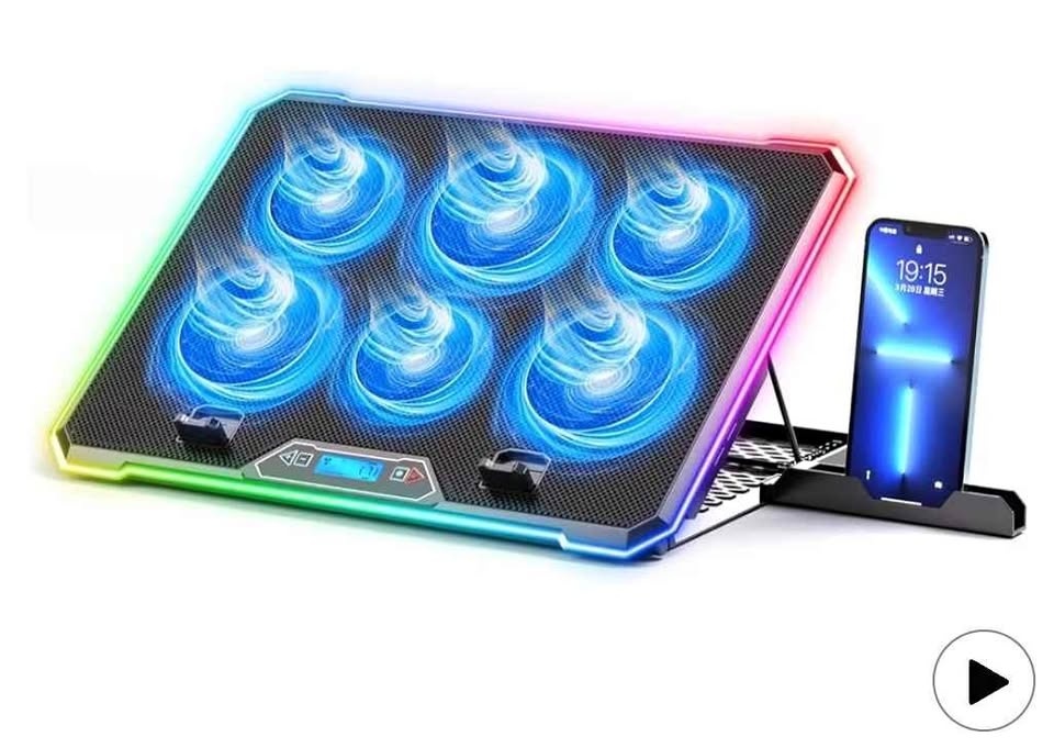 Gaming laptop cooler stand with 6 quiet fans, adjustable height (9 settings), LED lights, LCD screen, and 2 USB ports. Can also be used as a lap desk.