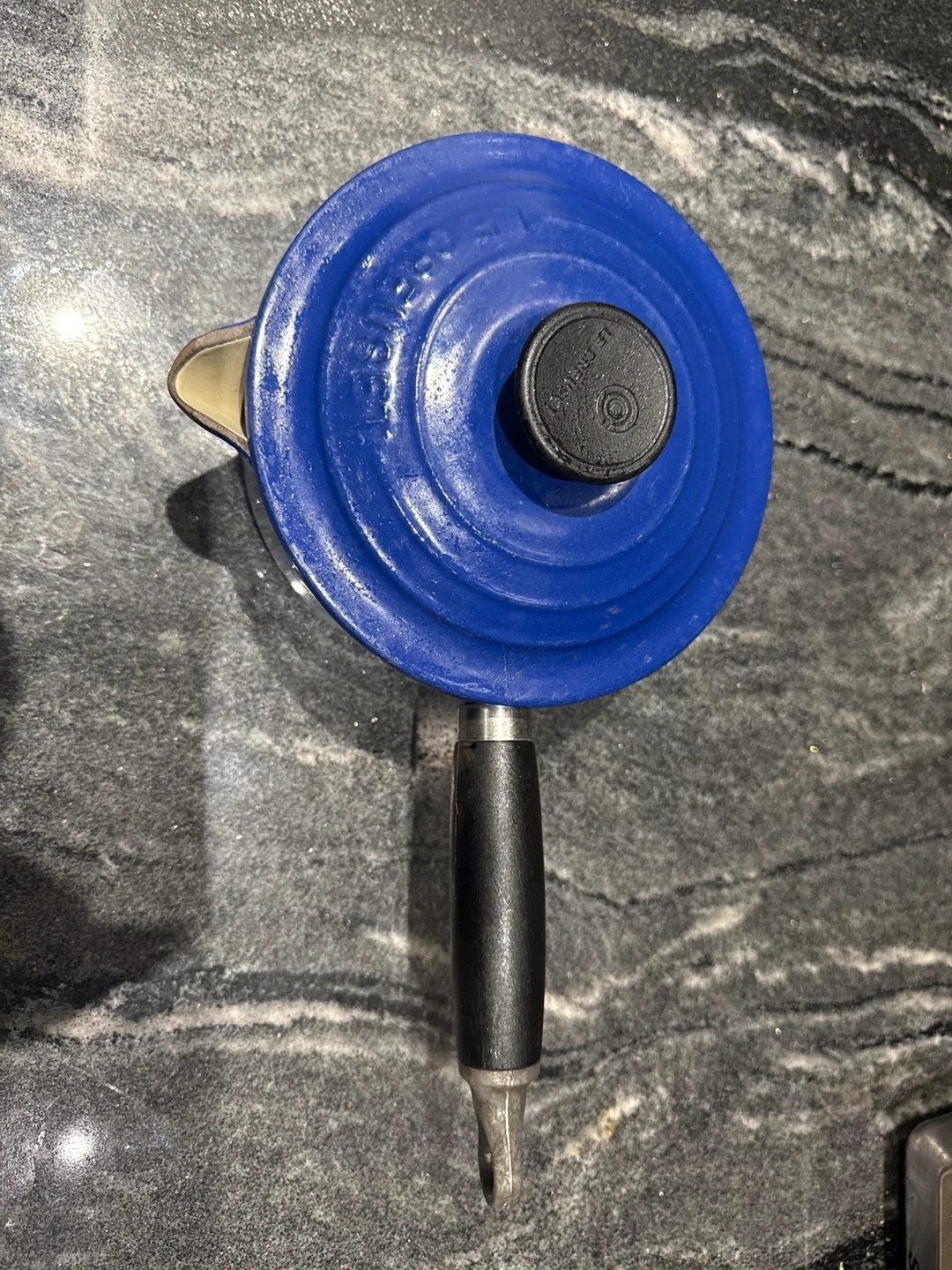 This is a Le Creuset enameled cast iron saucepan. It's a vibrant blue colour with a cream interior. It features a pouring spout and a black handle. It's great for making sauces or small batches of food!