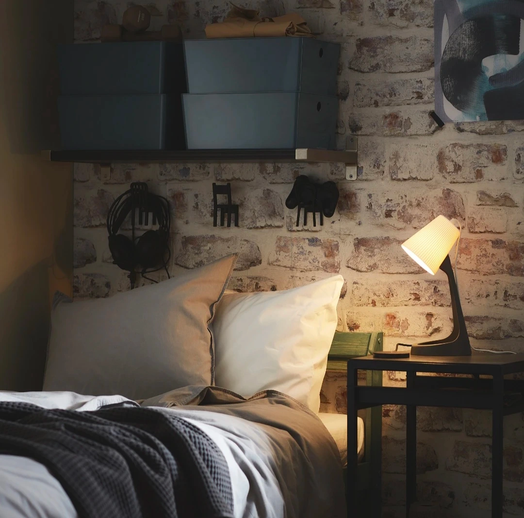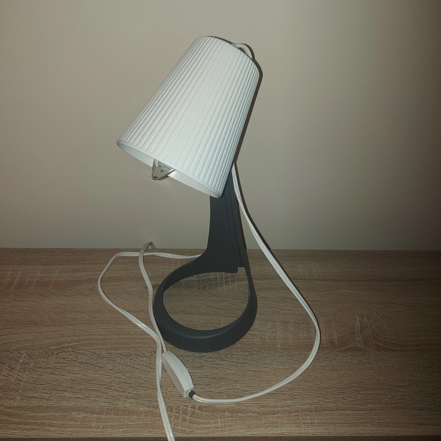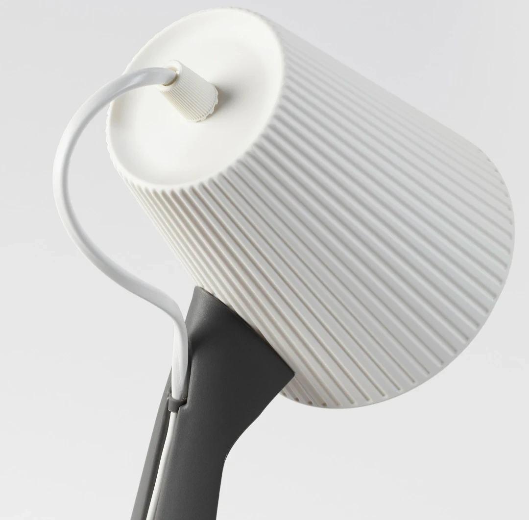 This IKEA FADO table lamp provides a warm, ambient glow. It features a textured white lampshade and a dark grey base. It's perfect for adding a cozy light to your bedside table or desk.