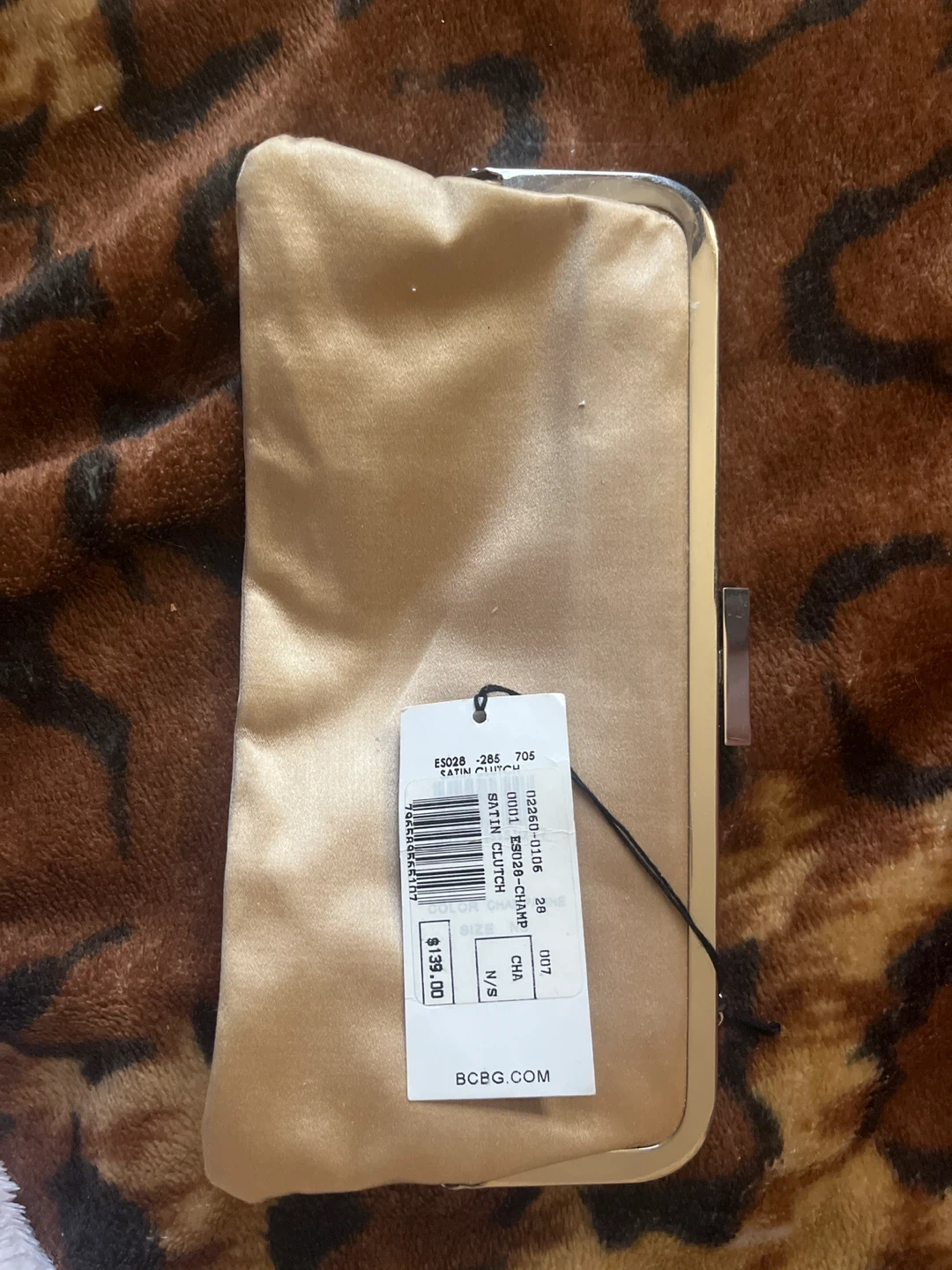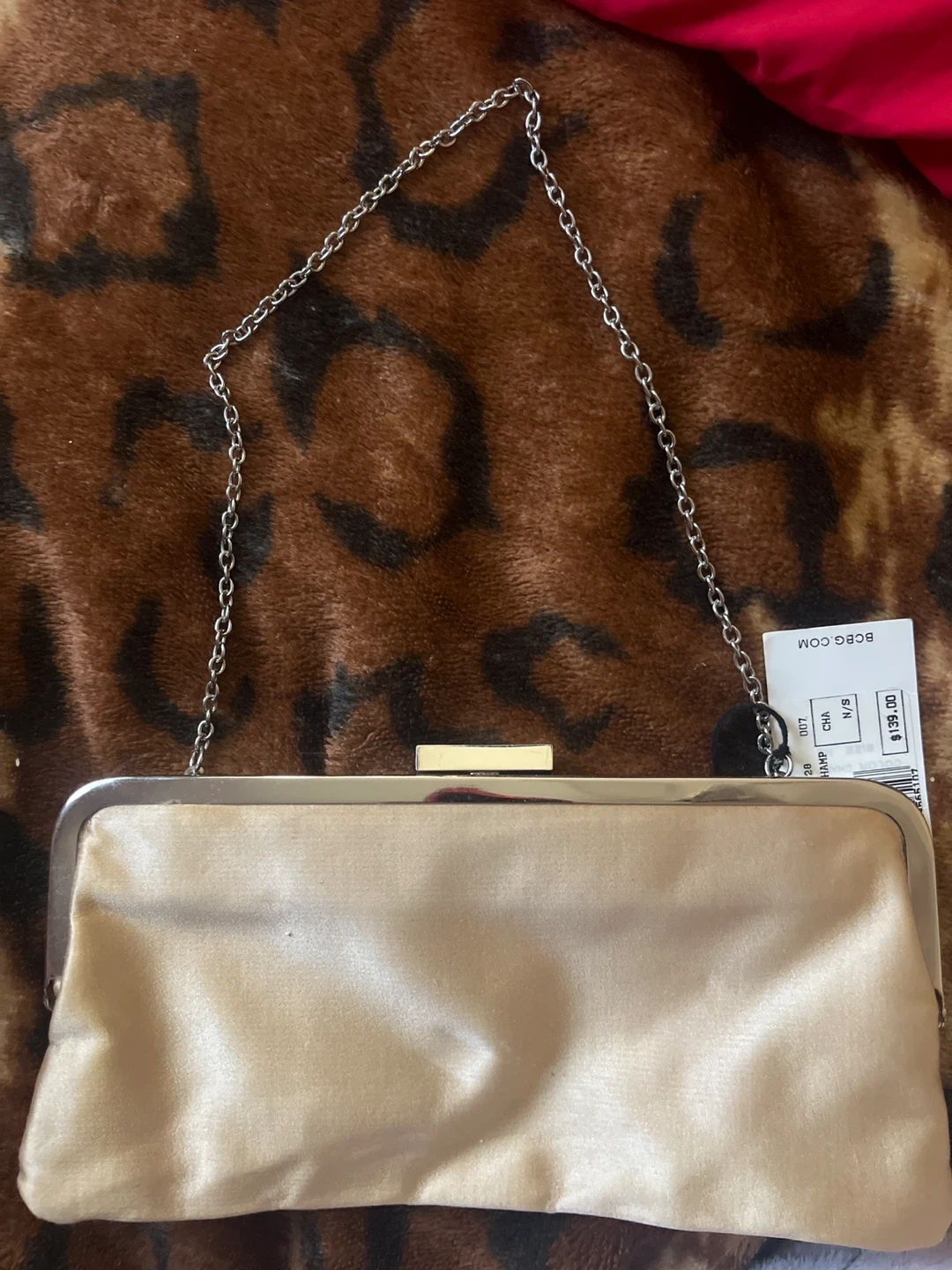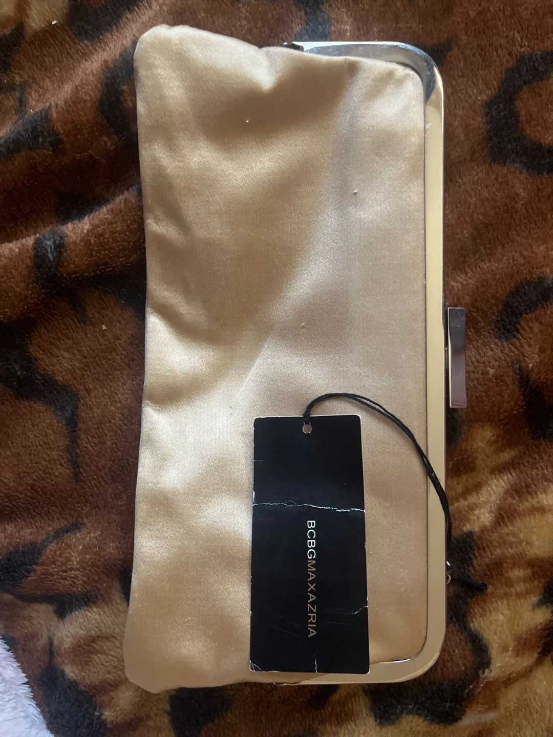 A BCBG MAX AZRIA satin clutch. It's gold coloured with a silver metal frame and clasp with silver chain strap. The original price was $139.00
