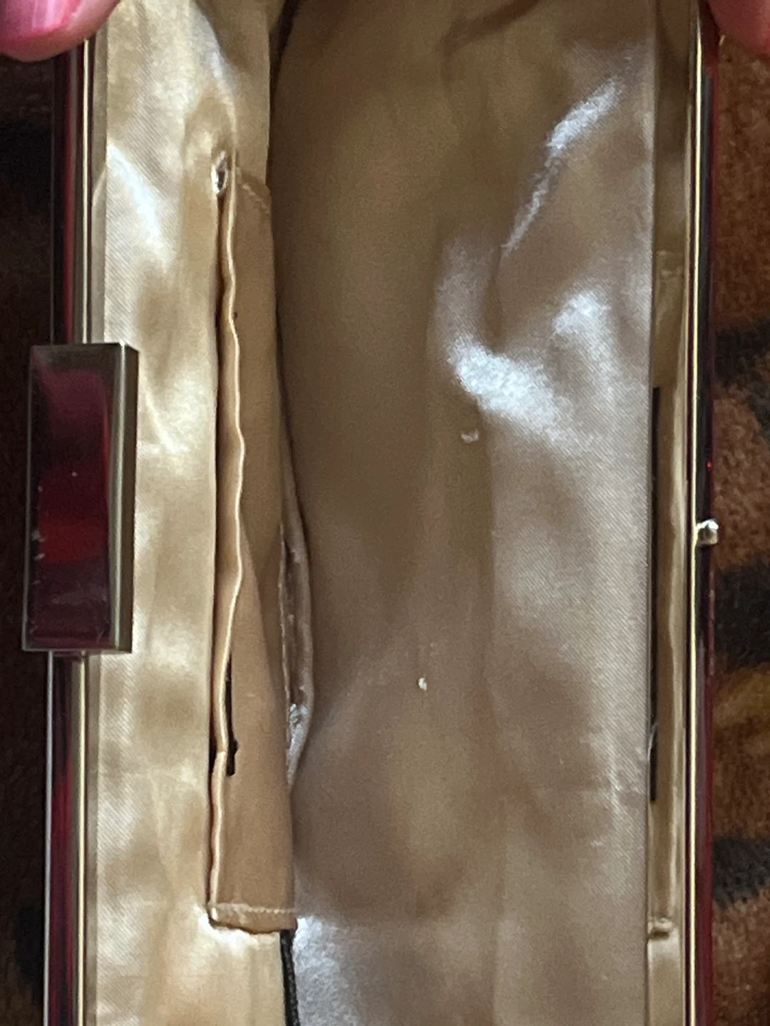 A BCBG MAX AZRIA satin clutch. It's gold coloured with a silver metal frame and clasp with silver chain strap. The original price was $139.00