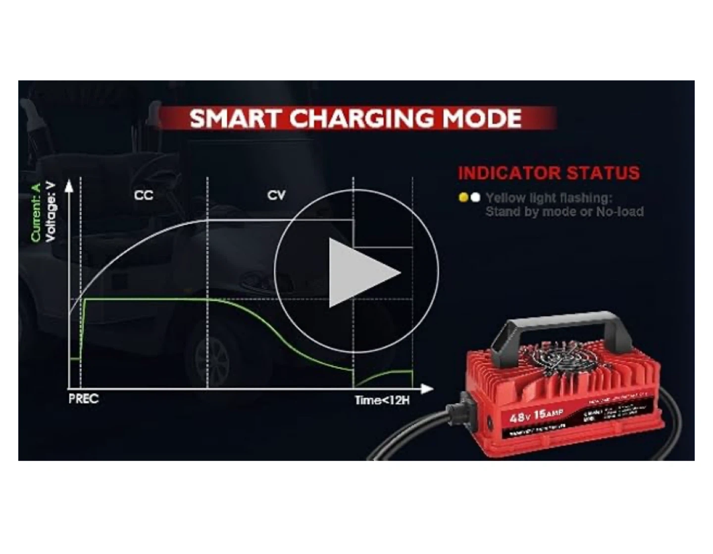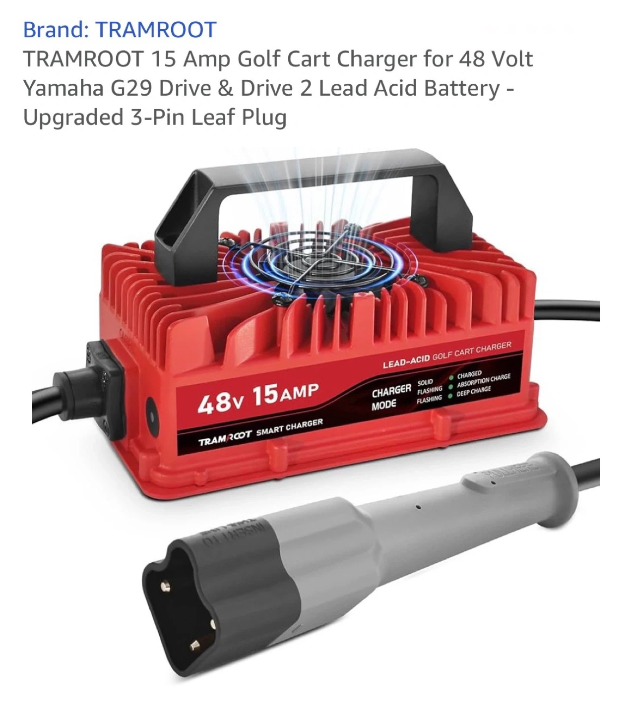 Selling a TRAMROOT 15 Amp golf cart charger for 48 Volt Yamaha G29 Drive & Drive 2 Lead Acid Battery. It features an upgraded 3-Pin Leaf Plug and a one-piece solid molding plug that solves copper core skewing and ensures reliable insertion. The charger has enhanced thermal conductivity and insulation performance, with a neat and beautiful appearance. It also features a smart charging mode and an 800W high power output for quick charging