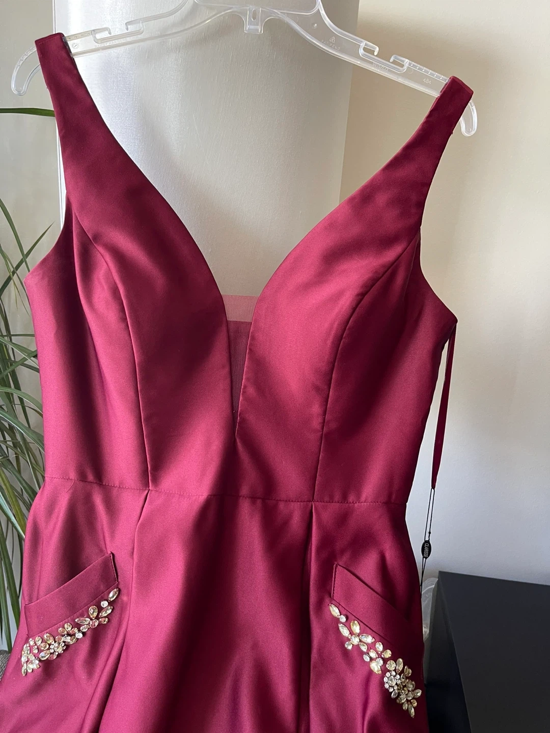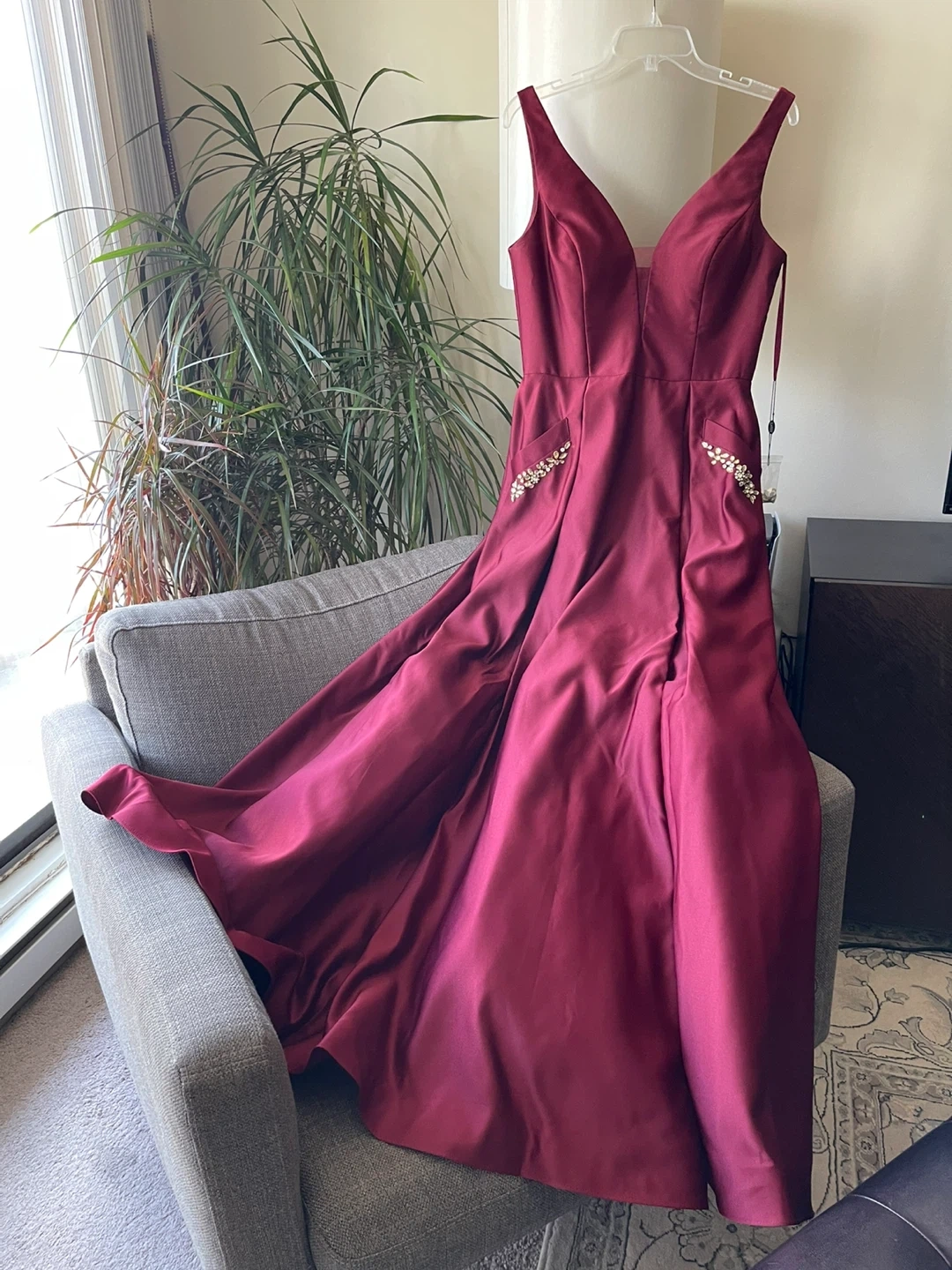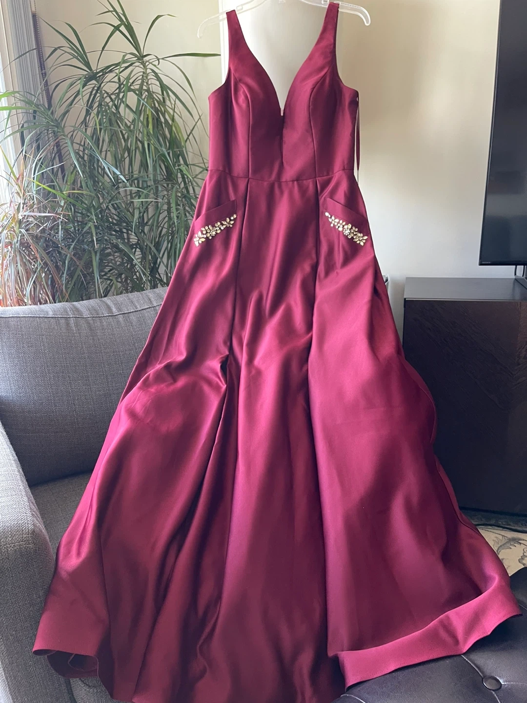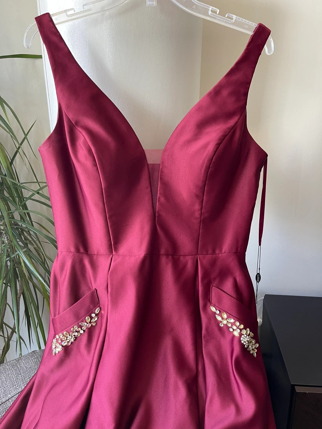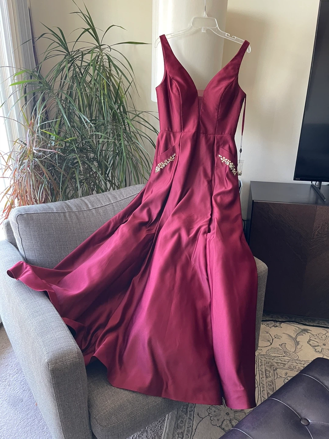Beautiful maroon satin gown with a V-neckline and lace-up back detail. Features jewelled pockets for added sparkle. Includes a bag of extra rhinestones.NEW never used!