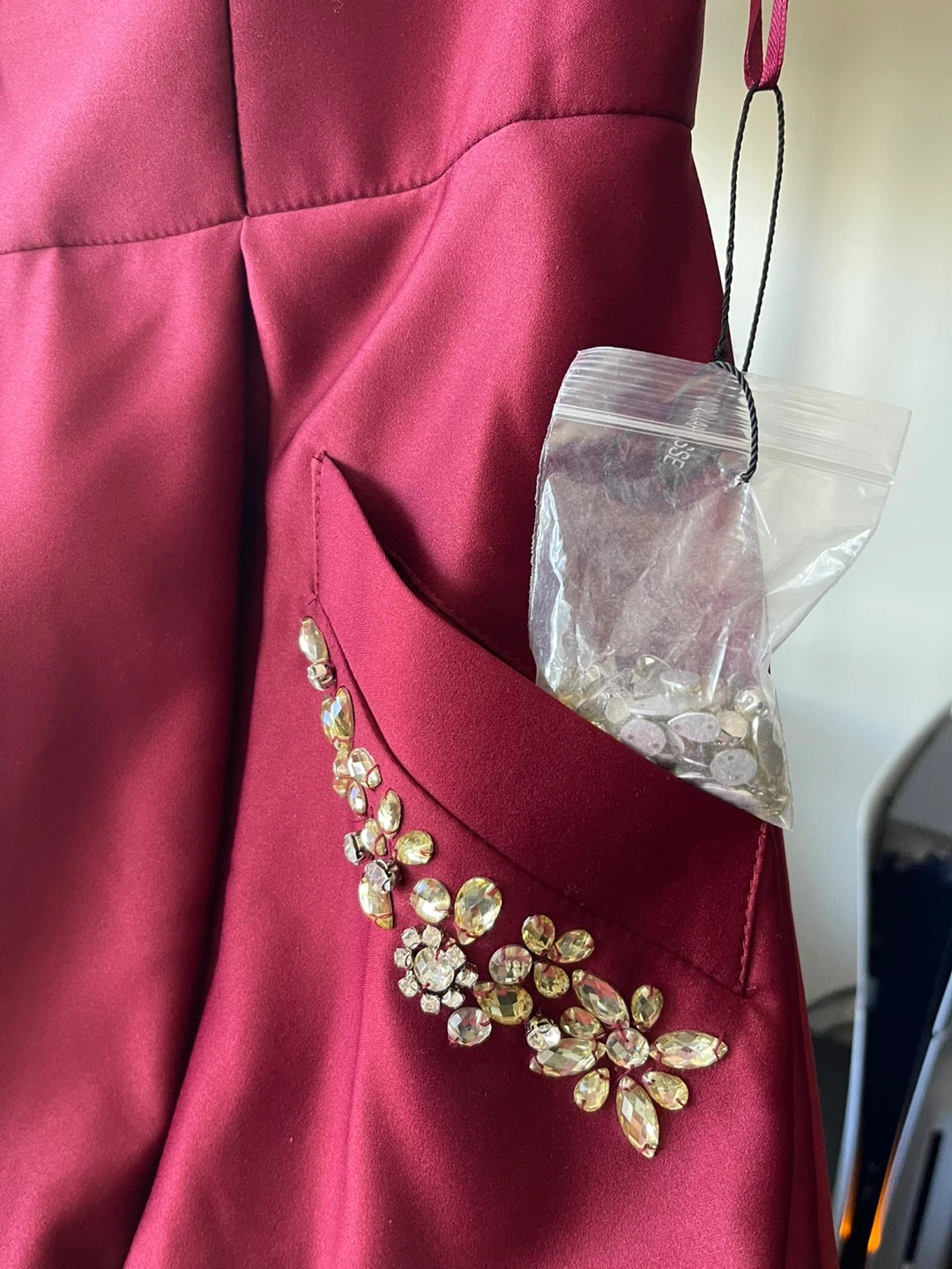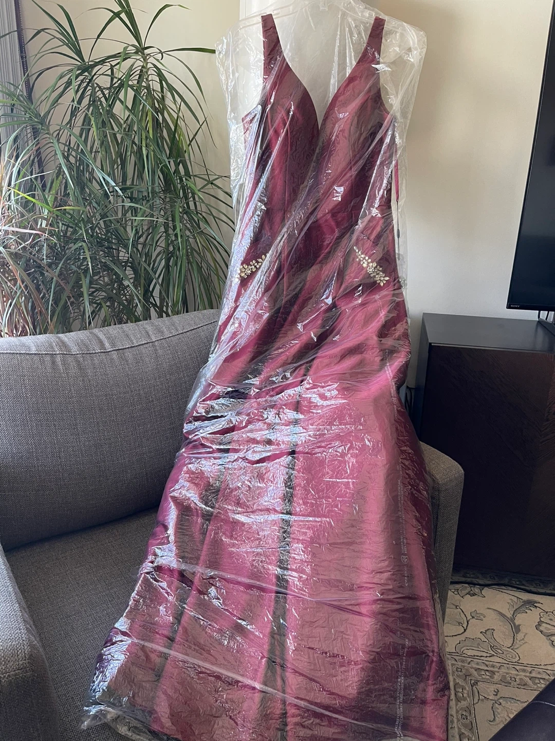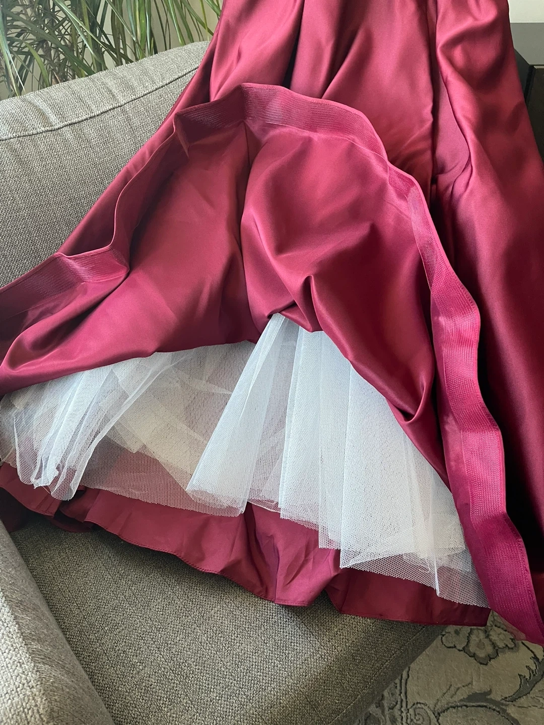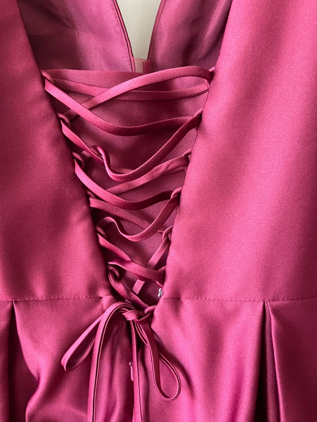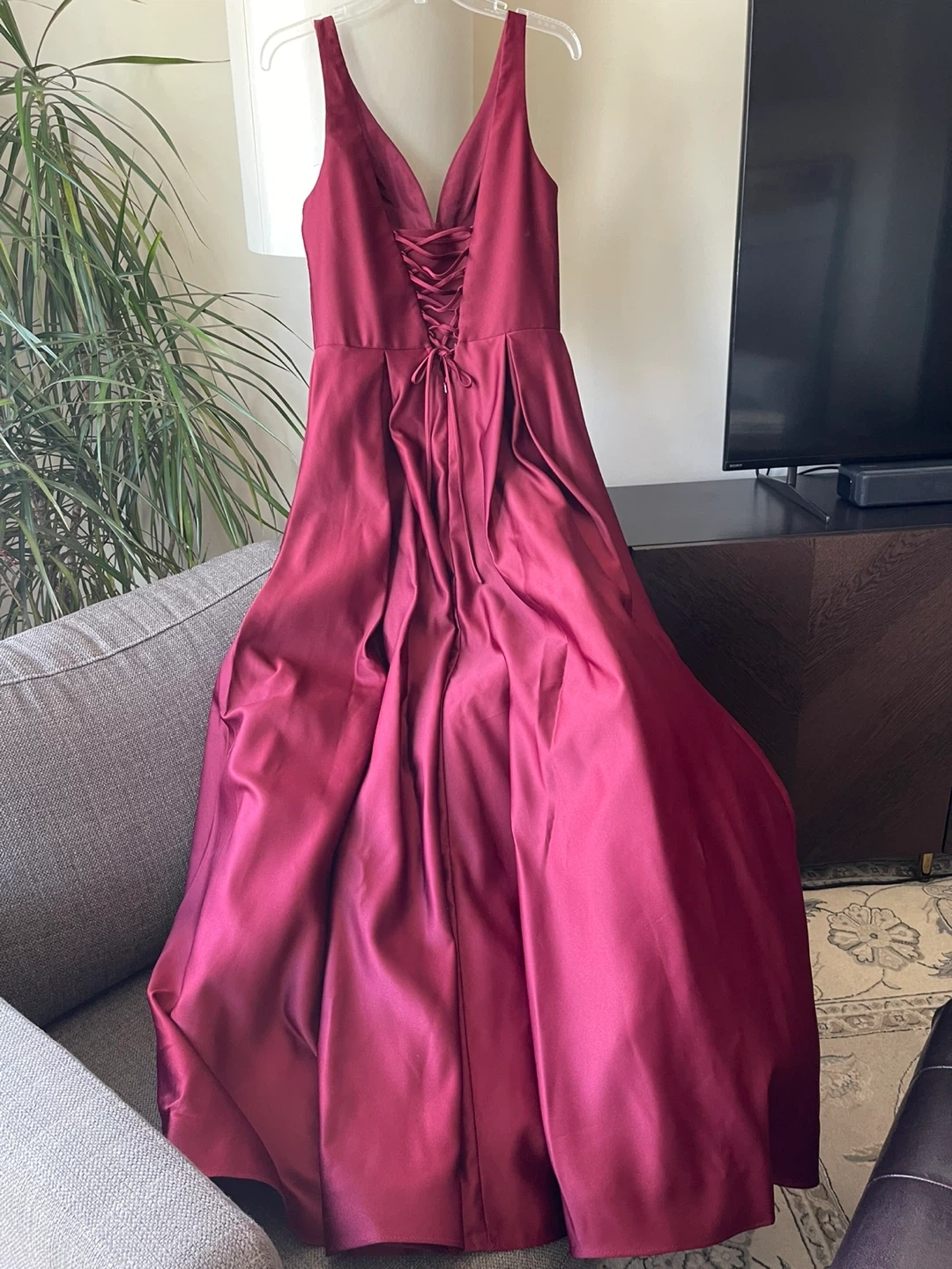 Beautiful maroon satin gown with a V-neckline and lace-up back detail. Features jewelled pockets for added sparkle. Includes a bag of extra rhinestones.NEW never used!