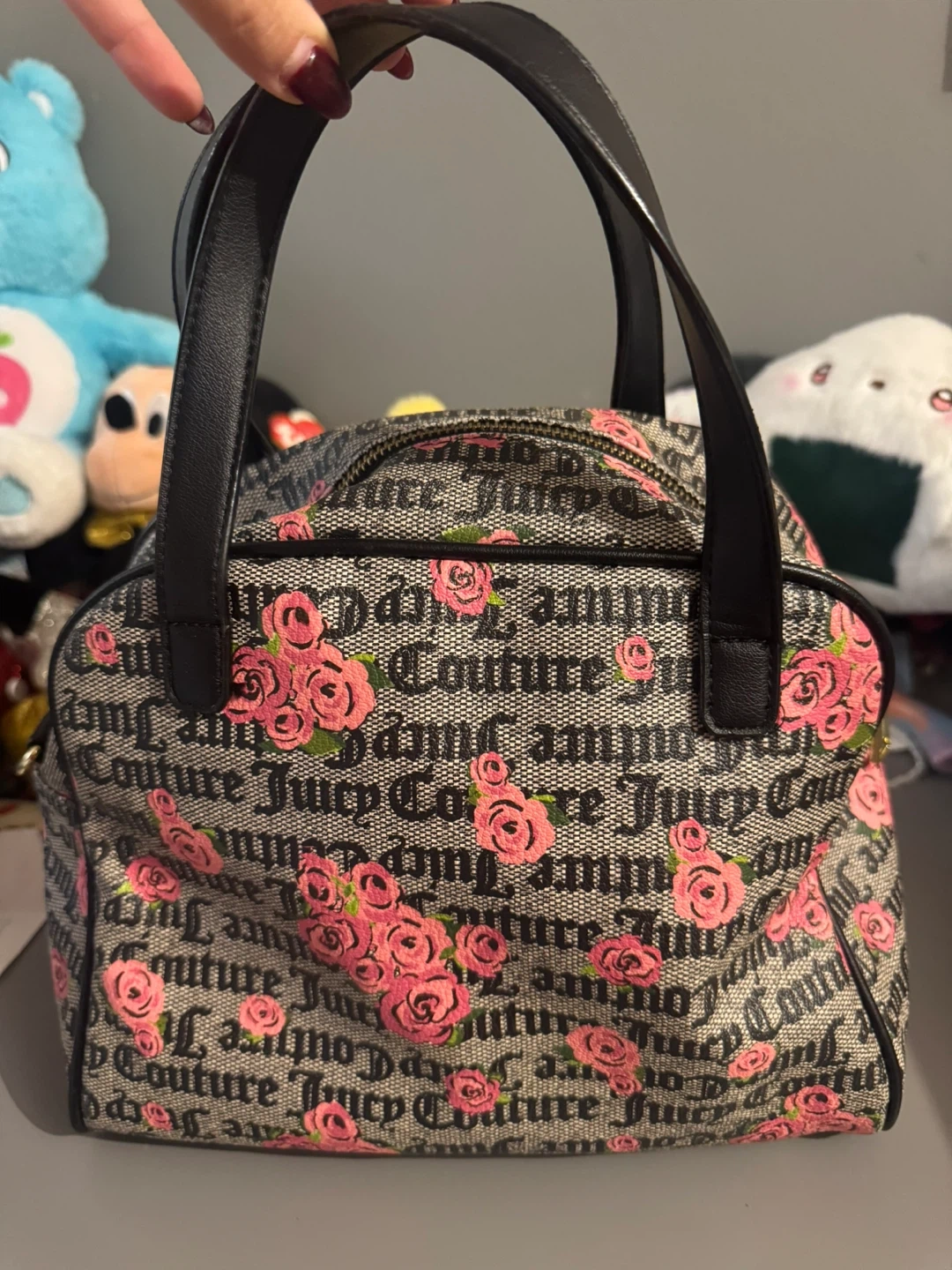 This Juicy Couture handbag features a classic monogram print with a vibrant rose pattern. It has a top zip closure and black leather handles. It's a stylish accessory for your everyday essentials!