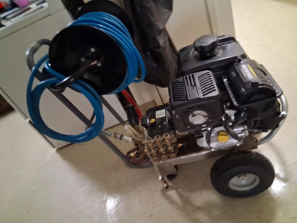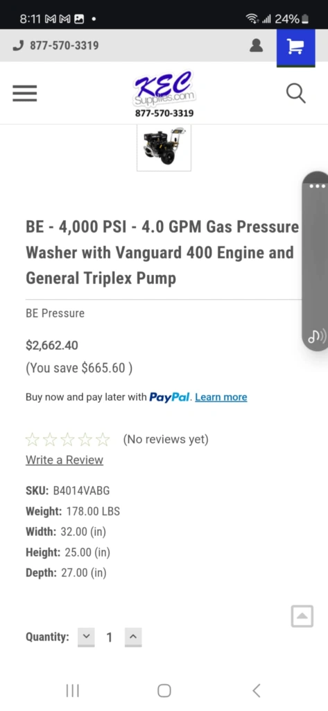 Selling a BE Pressure 4000 PSI gas pressure washer with a Vanguard 400 engine and General Triplex pump. It weighs 178 lbs, with dimensions of 32 inches in width, 25 inches in height, and 27 inches in depth