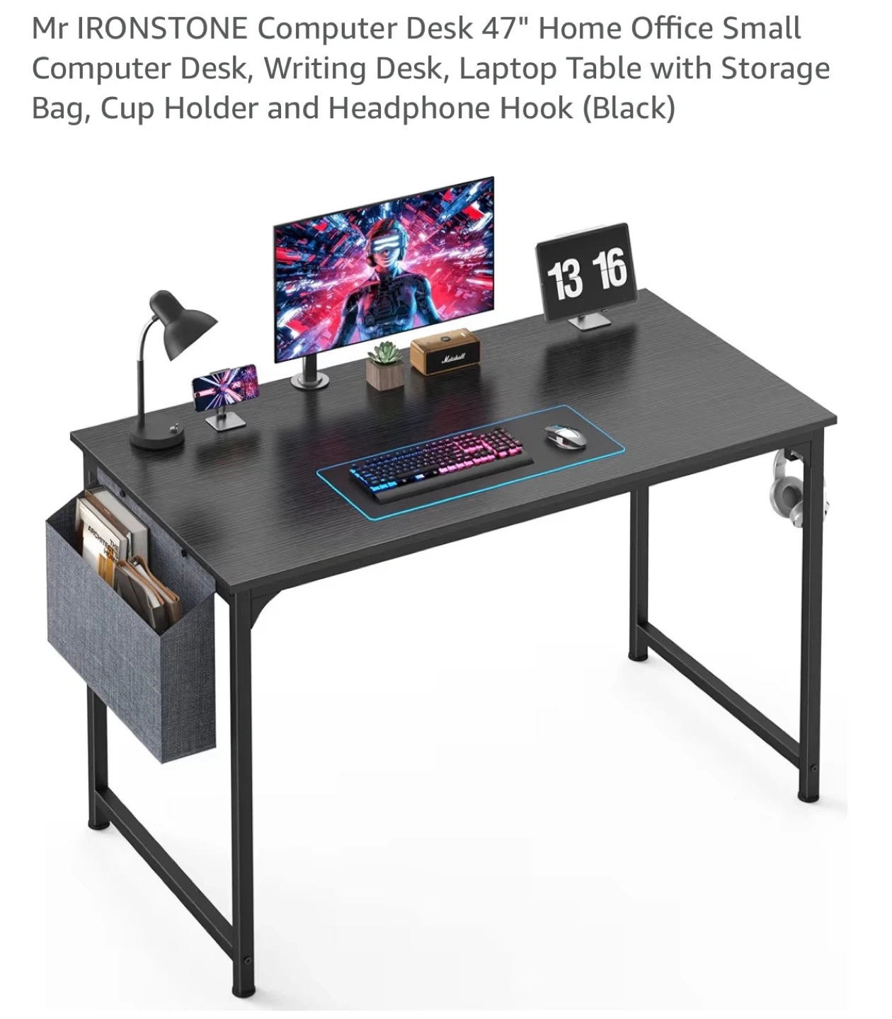 Selling a brand new Mr IRONSTONE 47" computer desk, still in its original packaging! This desk is perfect for a home office or small space. It features a storage bag, cup holder, and headphone hook. The desk is black and comes with all components included in the box.