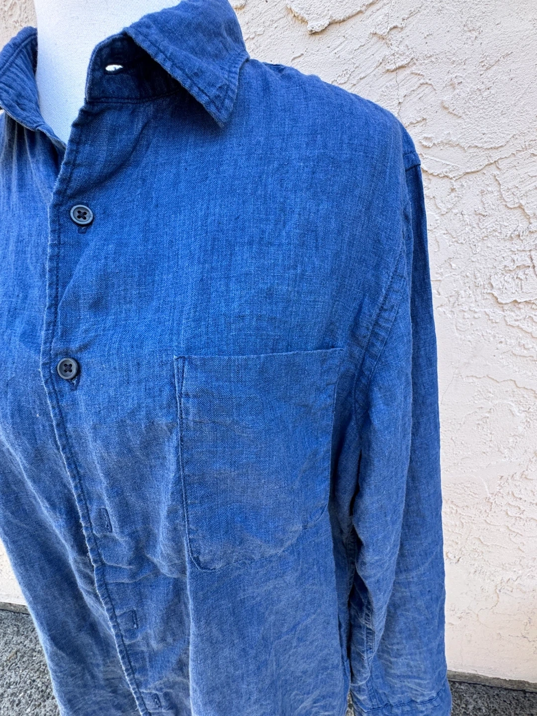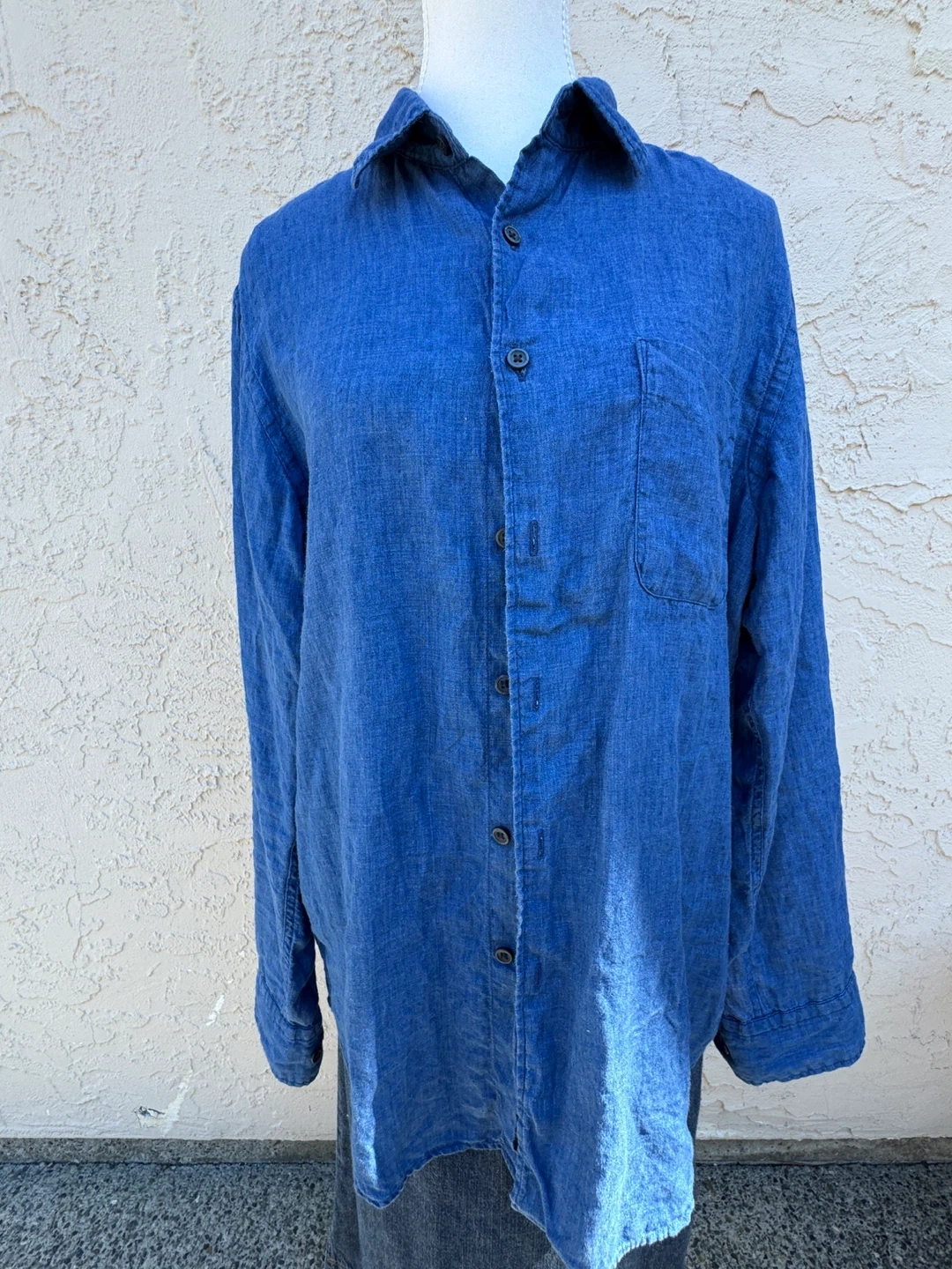 This blue linen shirt has a classic button-up style with a single chest pocket. It's a lightweight option for warmer weather. Long sleeves offer versatility.