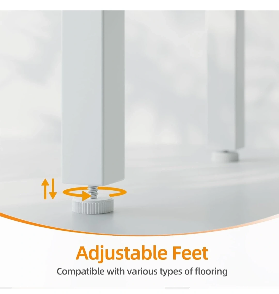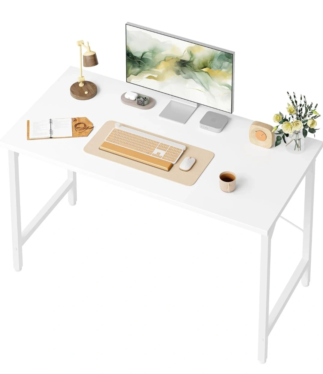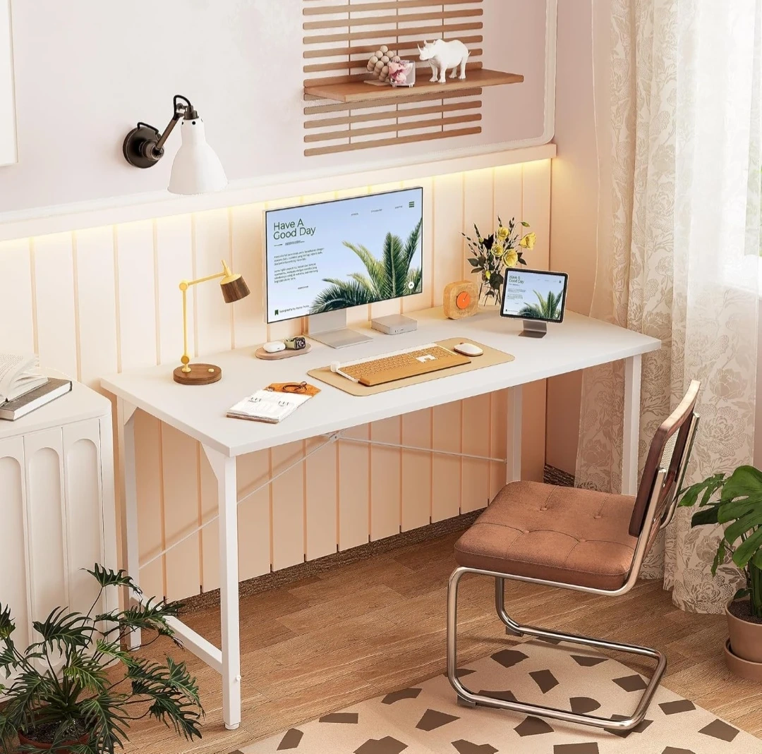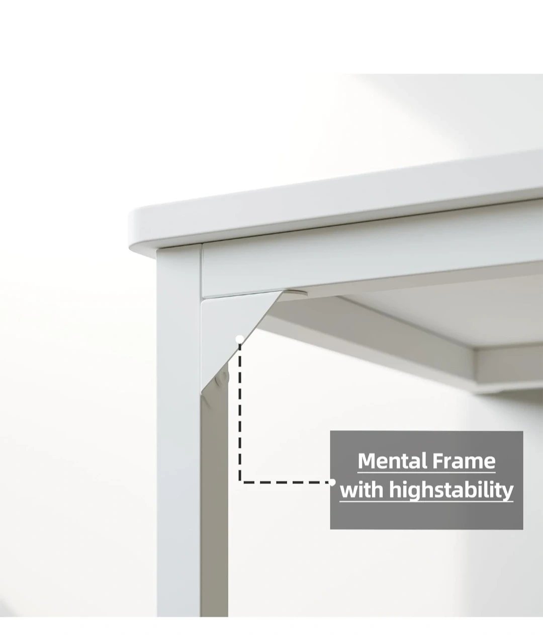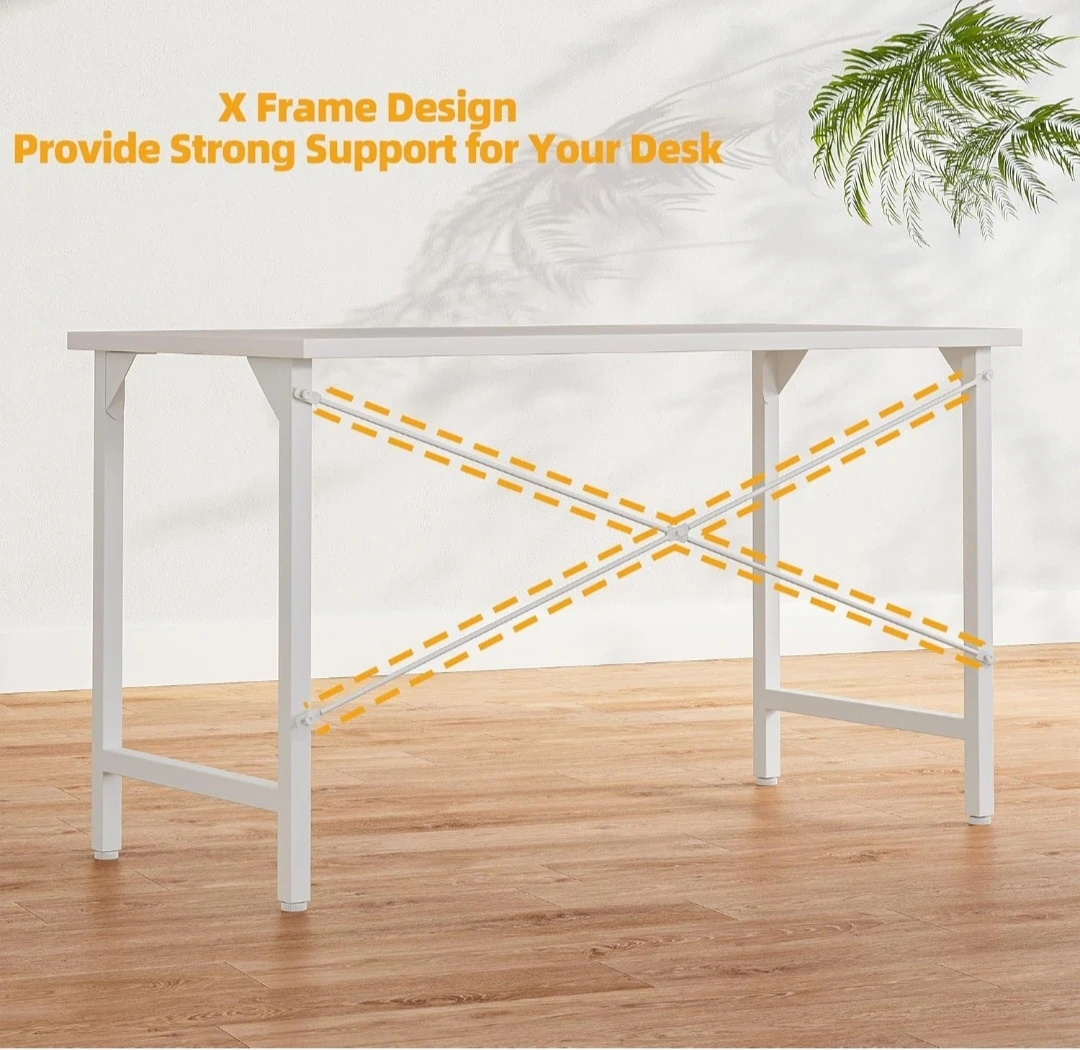 This white study desk features a metal frame for high stability. It measures 40" long by 18.9" deep and stands 29.5" tall. The desk has an X frame design providing strong support. It's suitable for home office use.