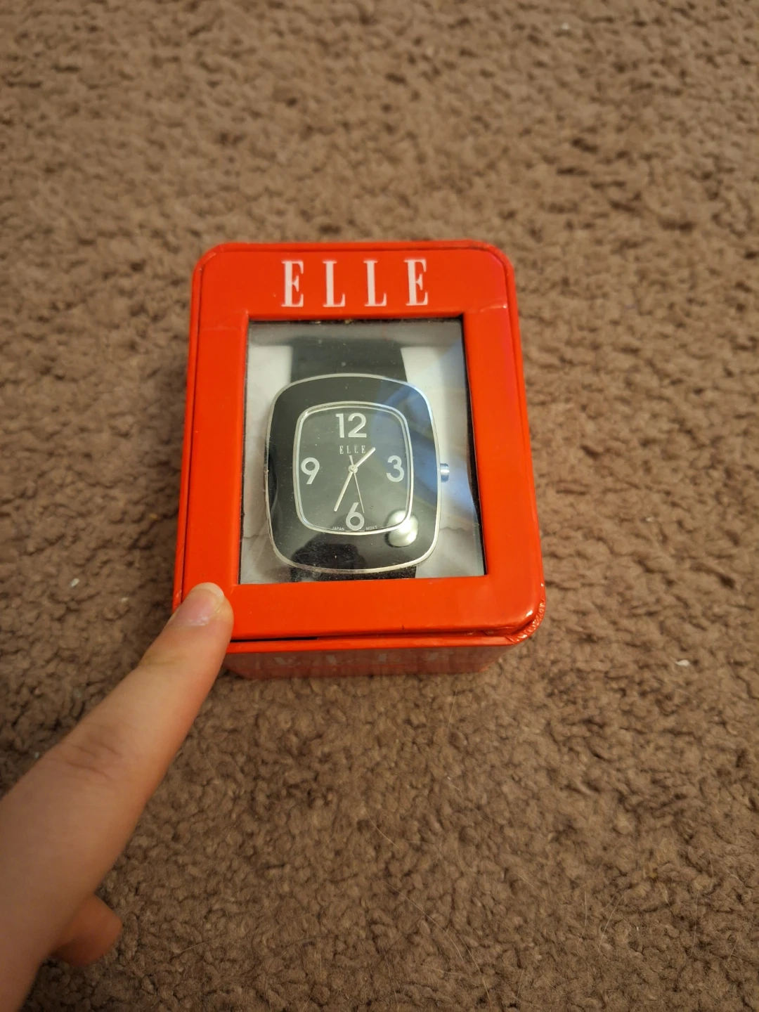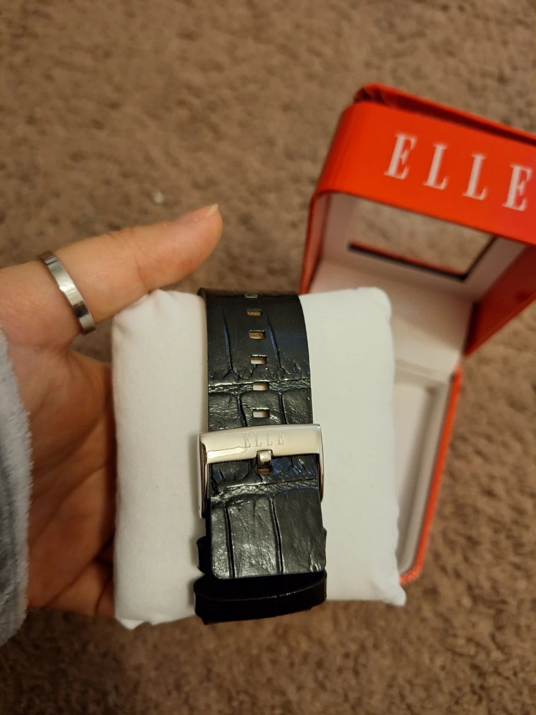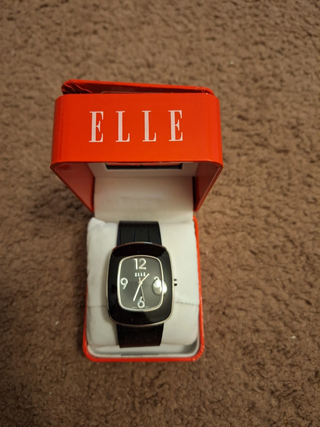 Pick up only! Selling an ELLE watch with a black strap. It comes in its original box, making it a great find! The watch face is a unique square shape with easy-to-read numbers. The strap has a textured, leather-like appearance.