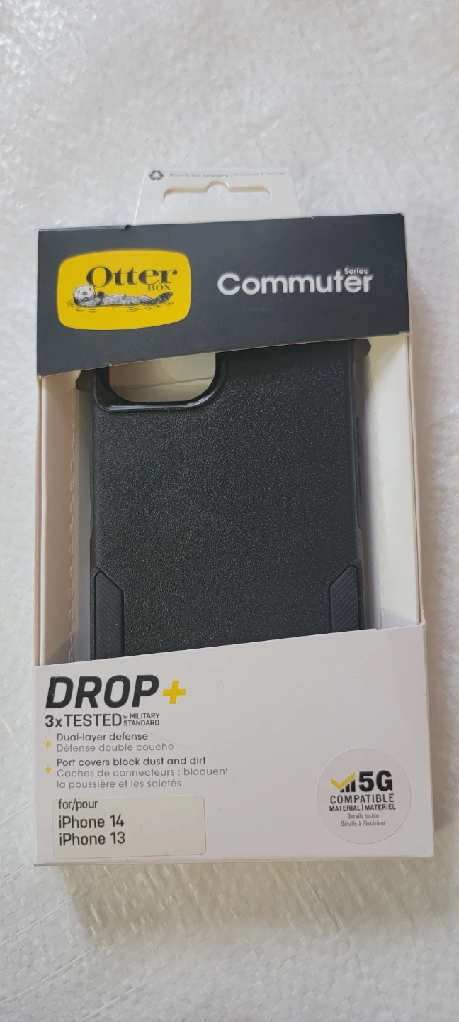 OtterBox Commuter Series DROP+ case for iPhone 14 and iPhone 13. Features dual-layer defence and port covers to block dust and dirt. Made with more than 35% recycled plastic.