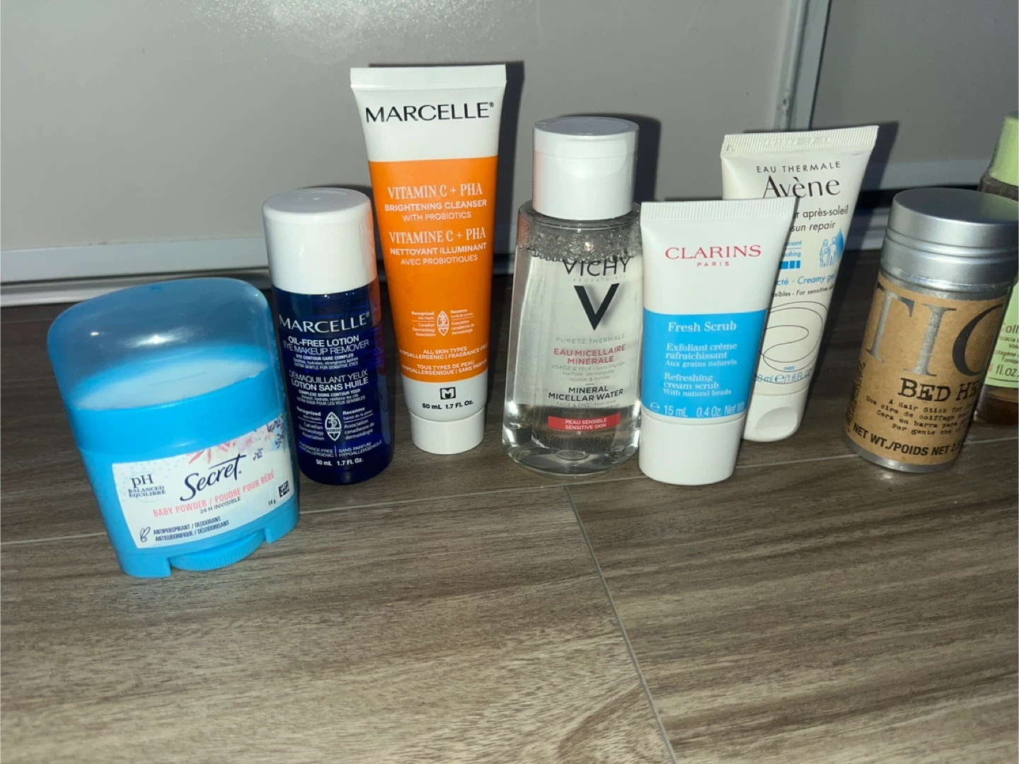 A collection of skincare and hair items including Clarins, Vichy, Avene, Pixi, Marcelle, and Bed Head. Products include micellar water, face scrub, serum, after-sun repair, and hair sticks. Great for trying out new products or for travel!