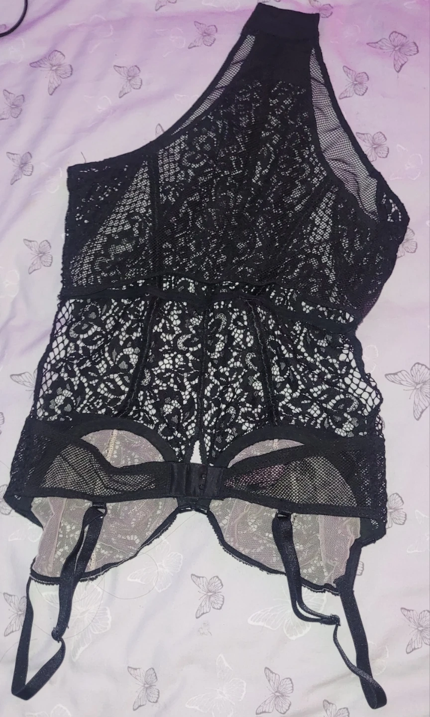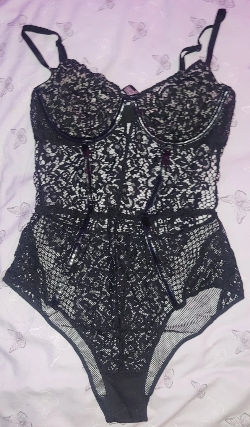 This is a black lace teddy by Victoria's Secret. It's a size 34C with adjustable straps. The teddy is made with lace and mesh fabrics.