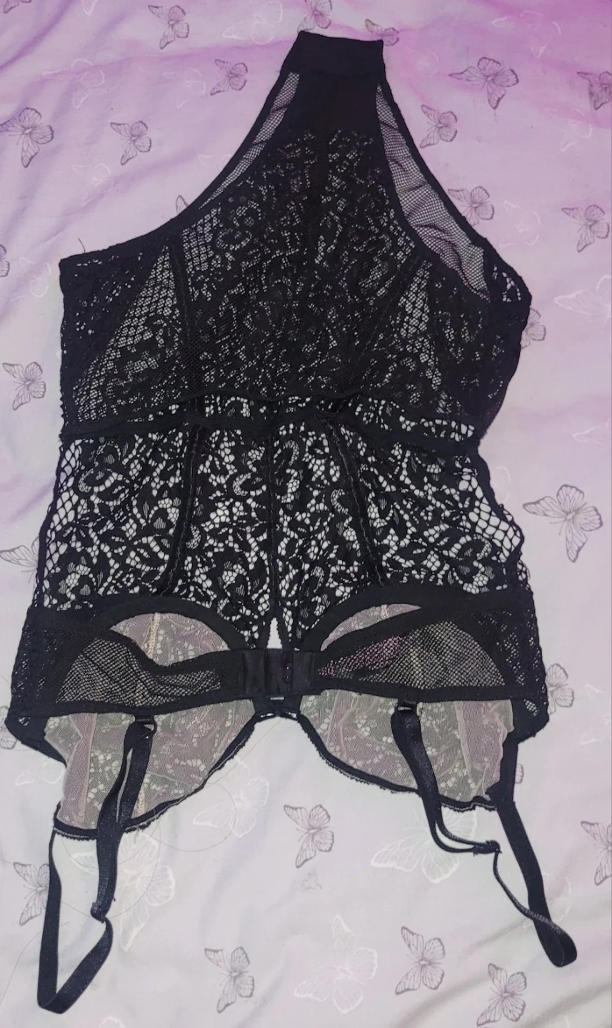 This is a black lace teddy by Victoria's Secret. It's a size 34C with adjustable straps. The teddy is made with lace and mesh fabrics.