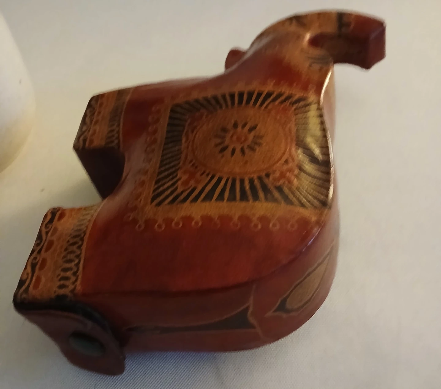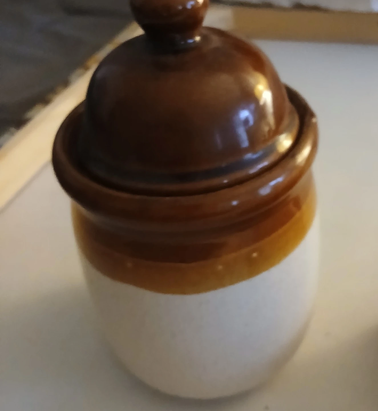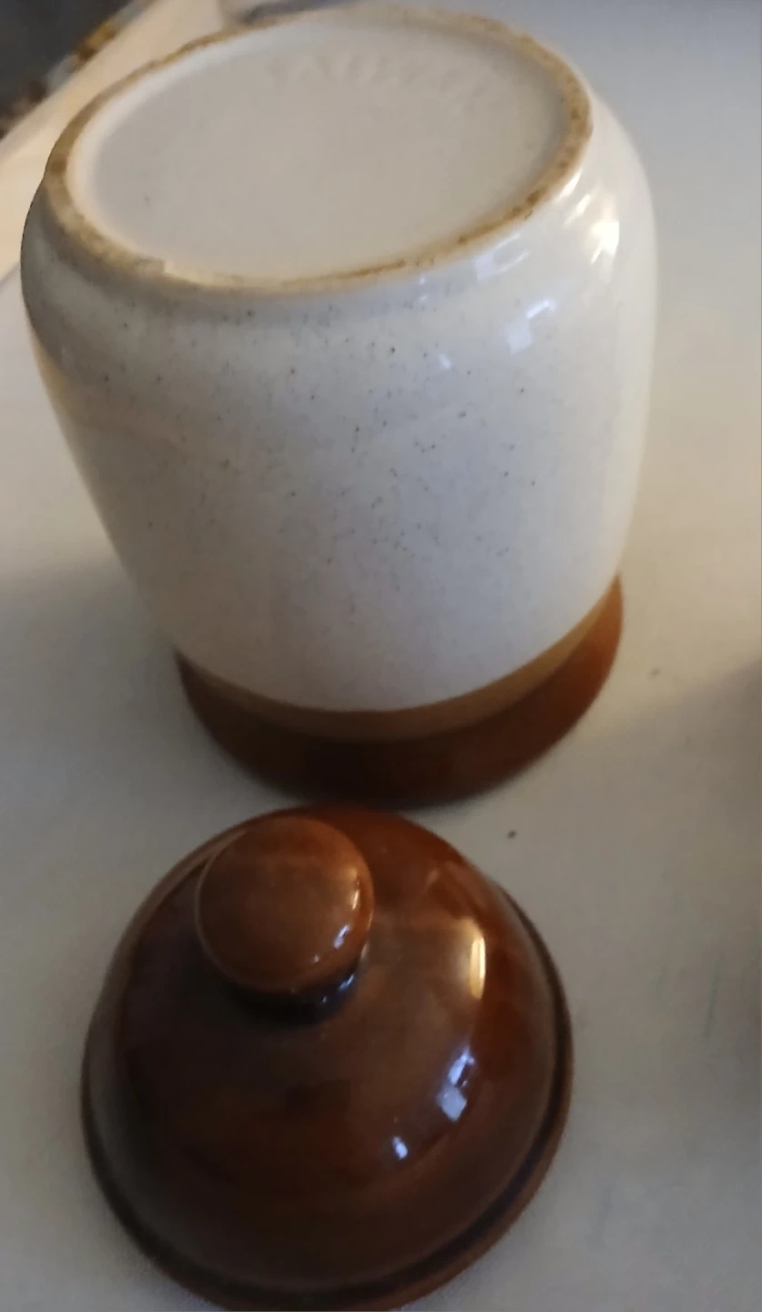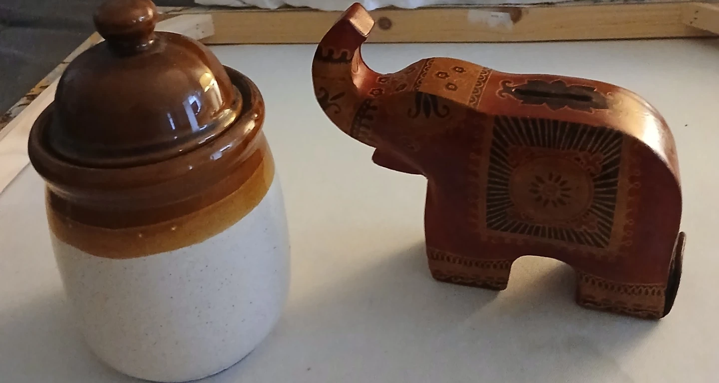 A small ceramic jar with a brown lid and a decorative elephant coin bank. The jar is a neutral cream colour with a brown band at the bottom. The elephant coin bank is red-brown with decorative patterns. Both items are good for storage or decoration.