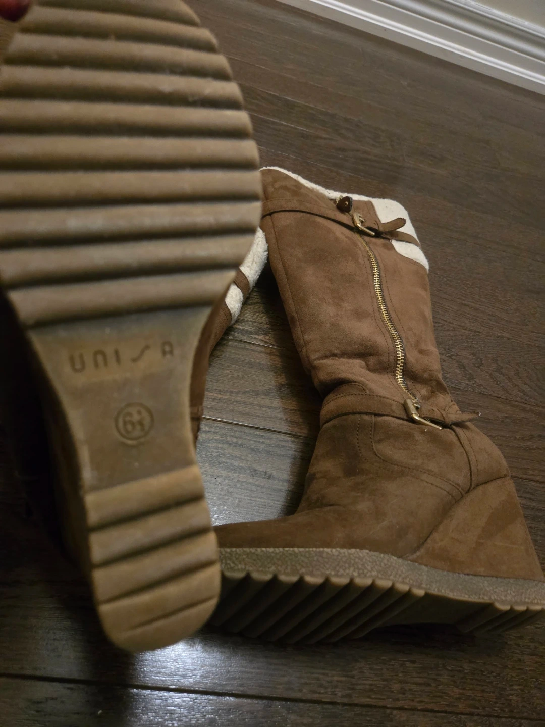 These Unisa knee high wedge boots are a rich brown colour. Full length zipper. Decorative exterior zipper and buckles. Fleece lined interior.