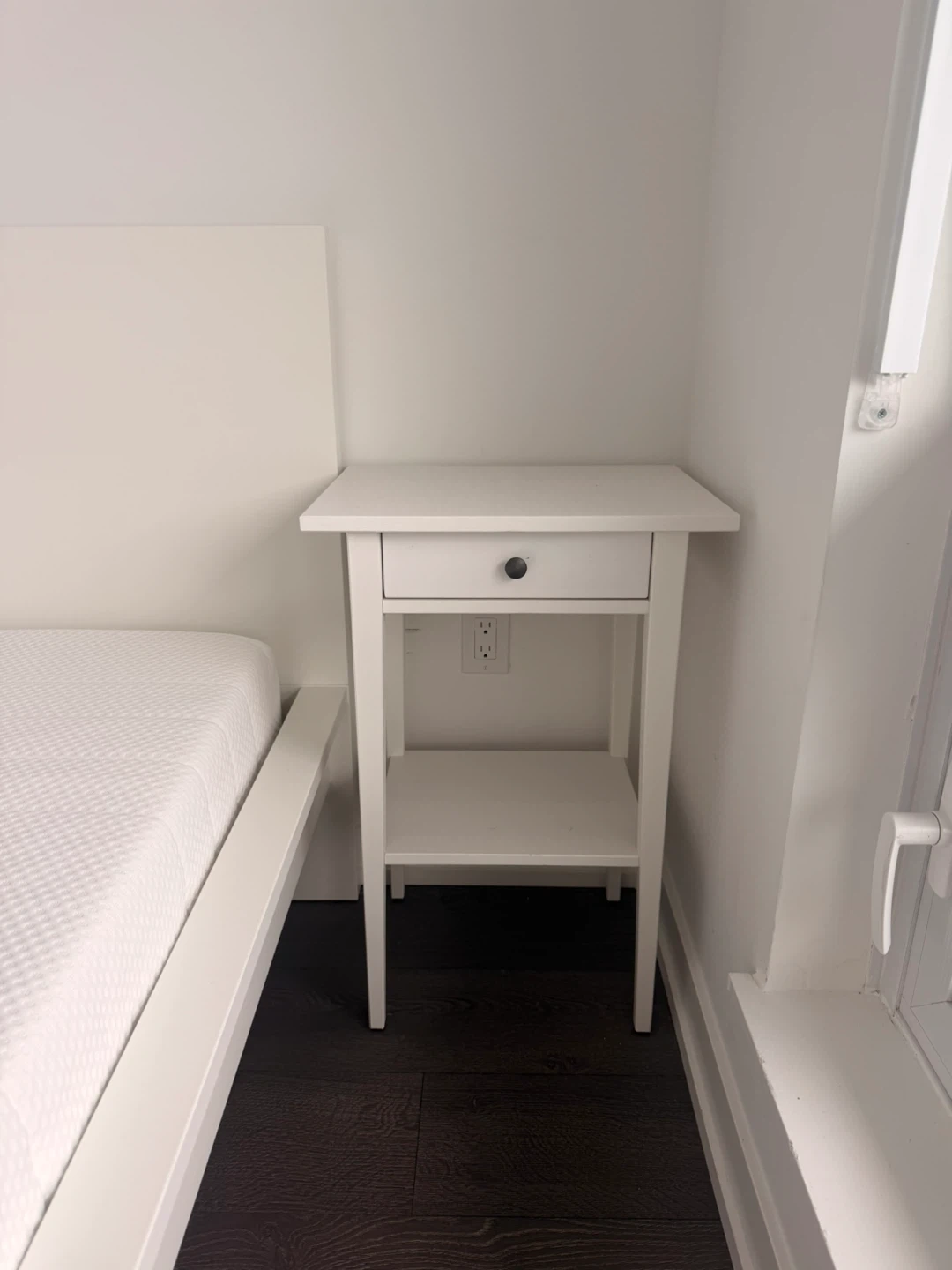 A clean white nightstand featuring a single drawer and an open shelf below.