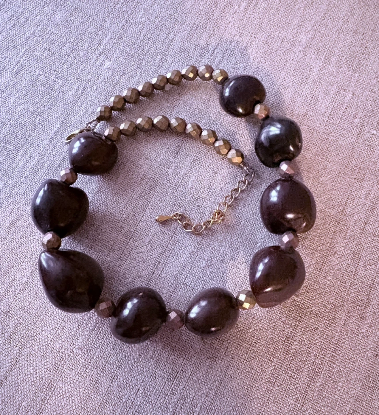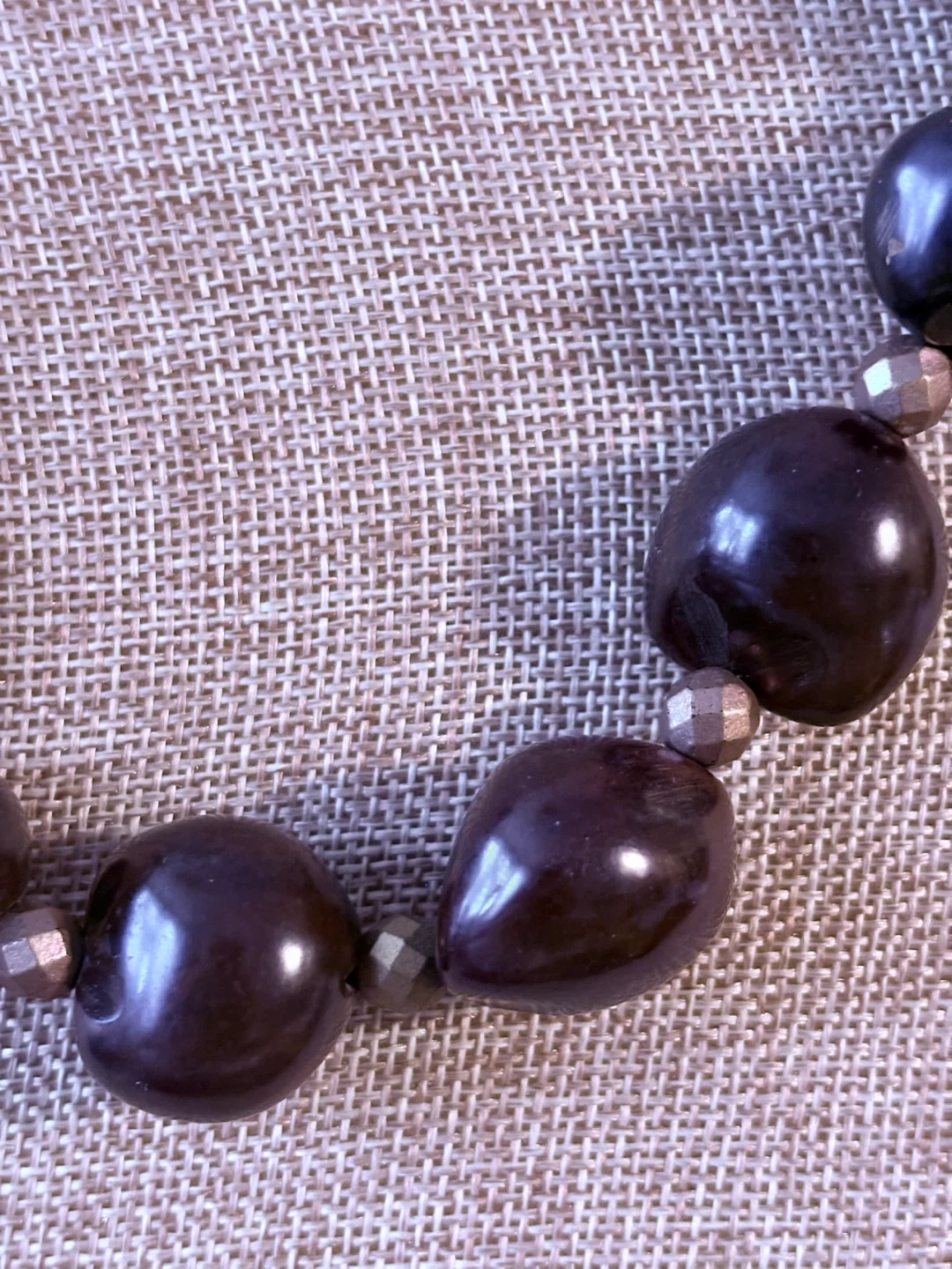 Chunky dark brown Kukui beads statement necklace with faceted Czech glass accents. Large, polished beads create a bold look. This piece adds a touch of drama to any outfit!
