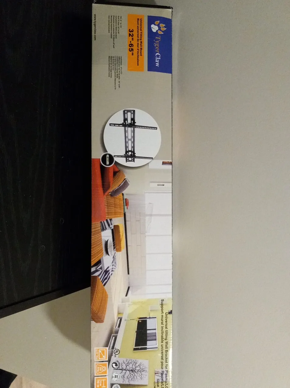This is a Tyger Claw universal tilting wall mount suitable for TVs from 32 to 65 inches. It's compliant with VESA standards and extends 52mm off the wall. Bought new & never taken out of the box.