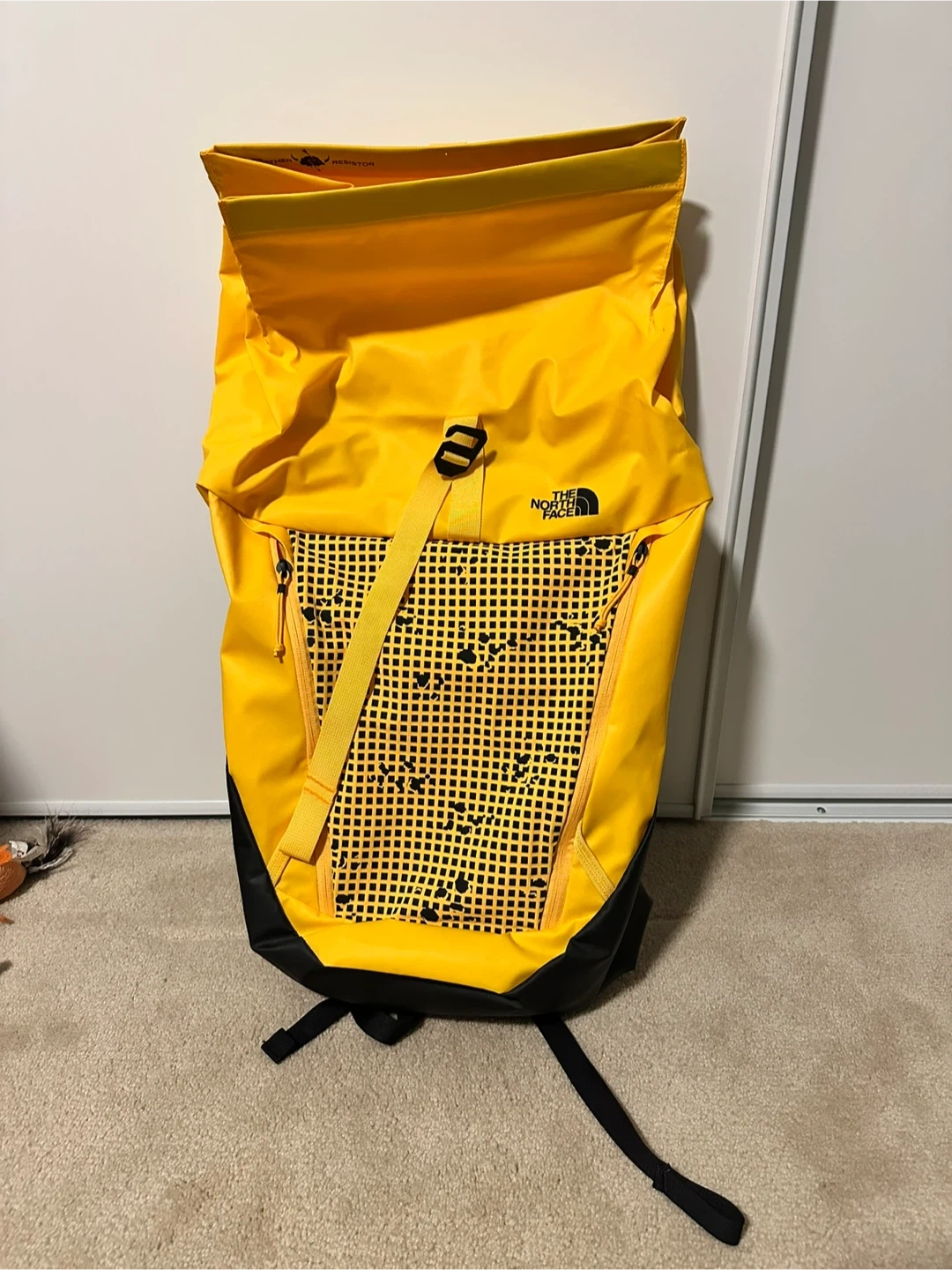 This is The North Face backpack in a bright yellow colour. It features a roll-top closure and a padded laptop sleeve inside. It's great for everyday use or for short trips! 27L