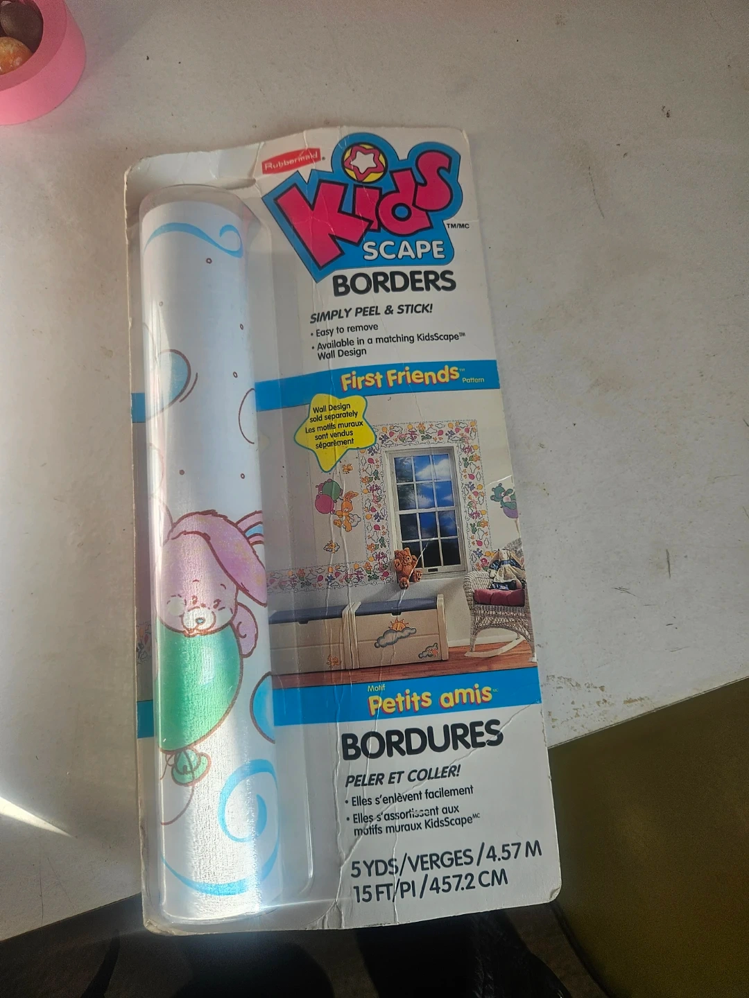 This is a roll of Rubbermaid KidsScape peel-and-stick wall borders in the First Friends pattern. It's easy to remove and designed to match other KidsScape wall designs. The border is 5 yards or 4.57 meters long.