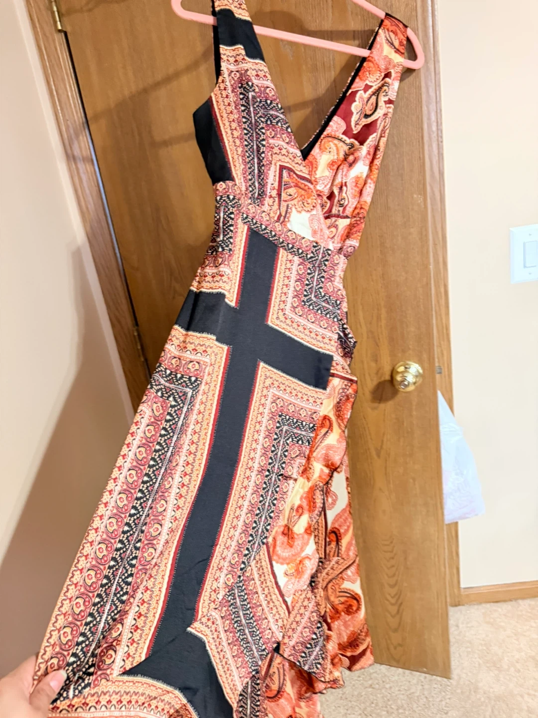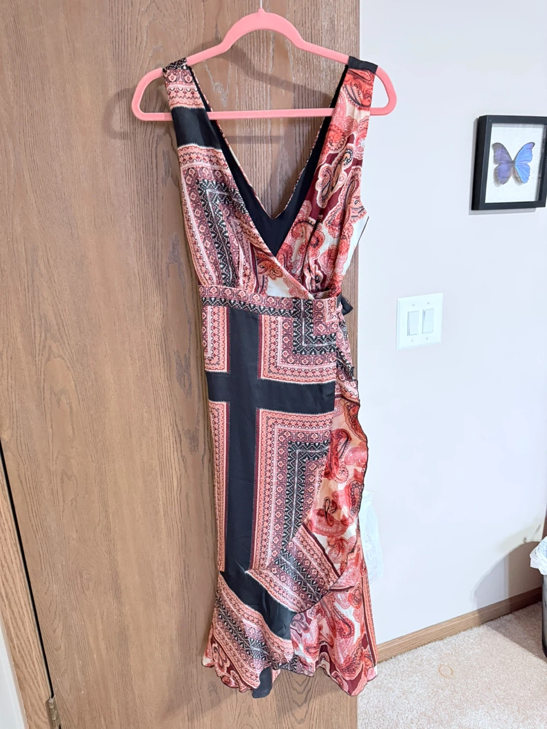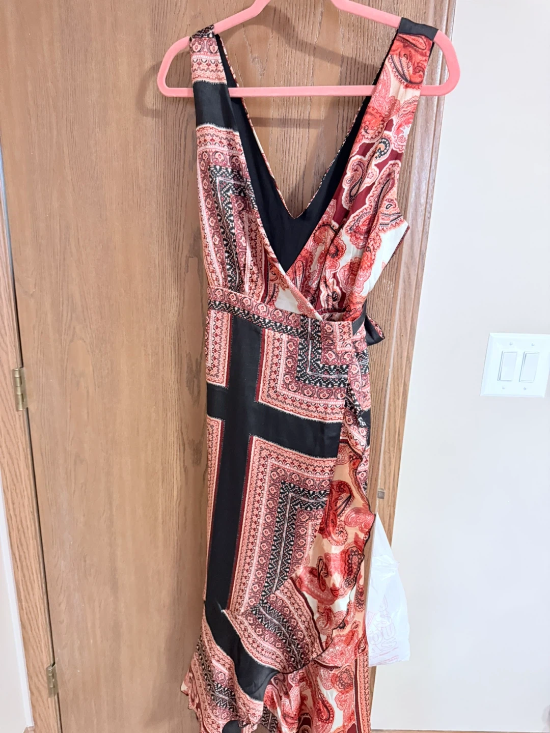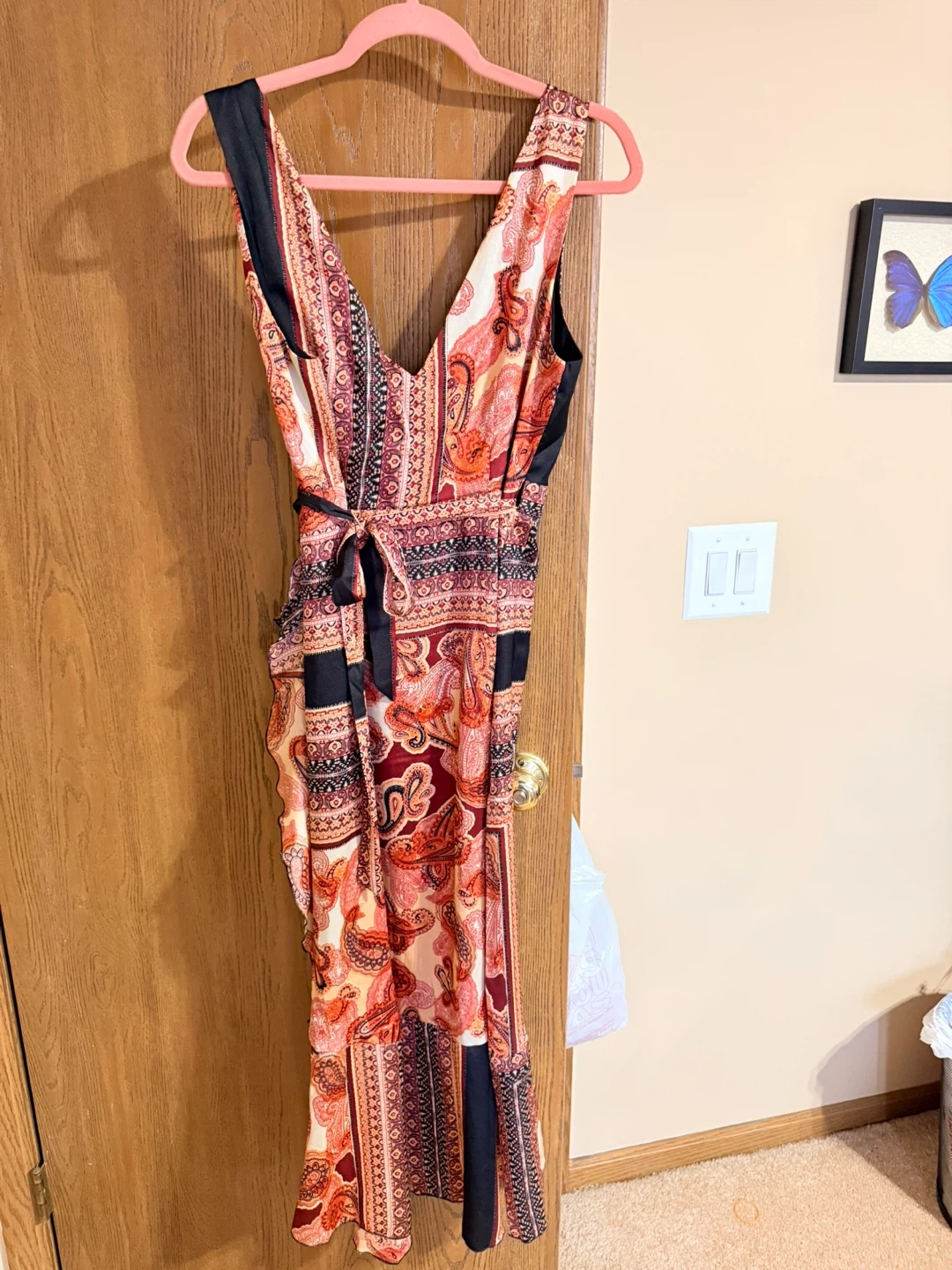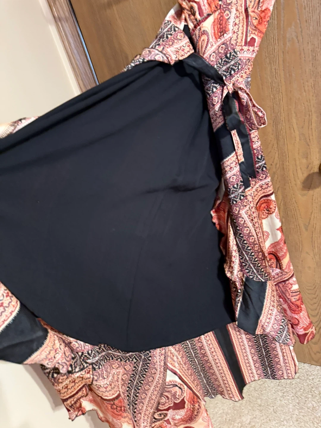 Lulus Beautiful paisley print maxi dress with a flattering wrap style and tie waist. Sleeveless design with a V-neck. Sheer outer layer with a solid black lining.