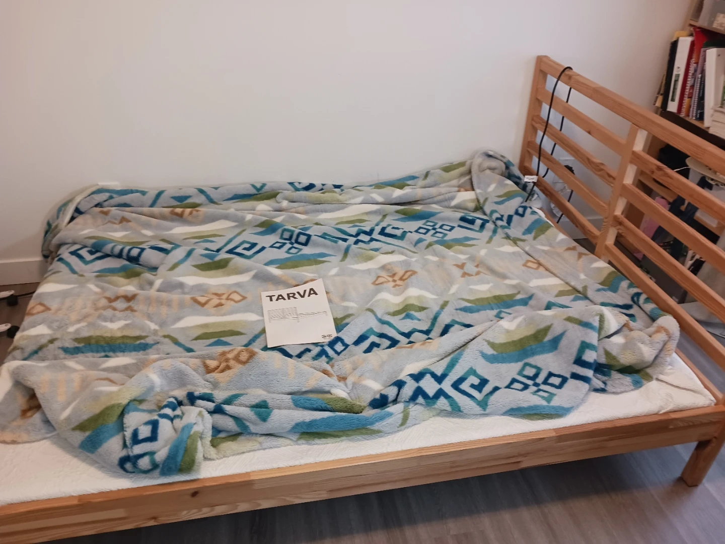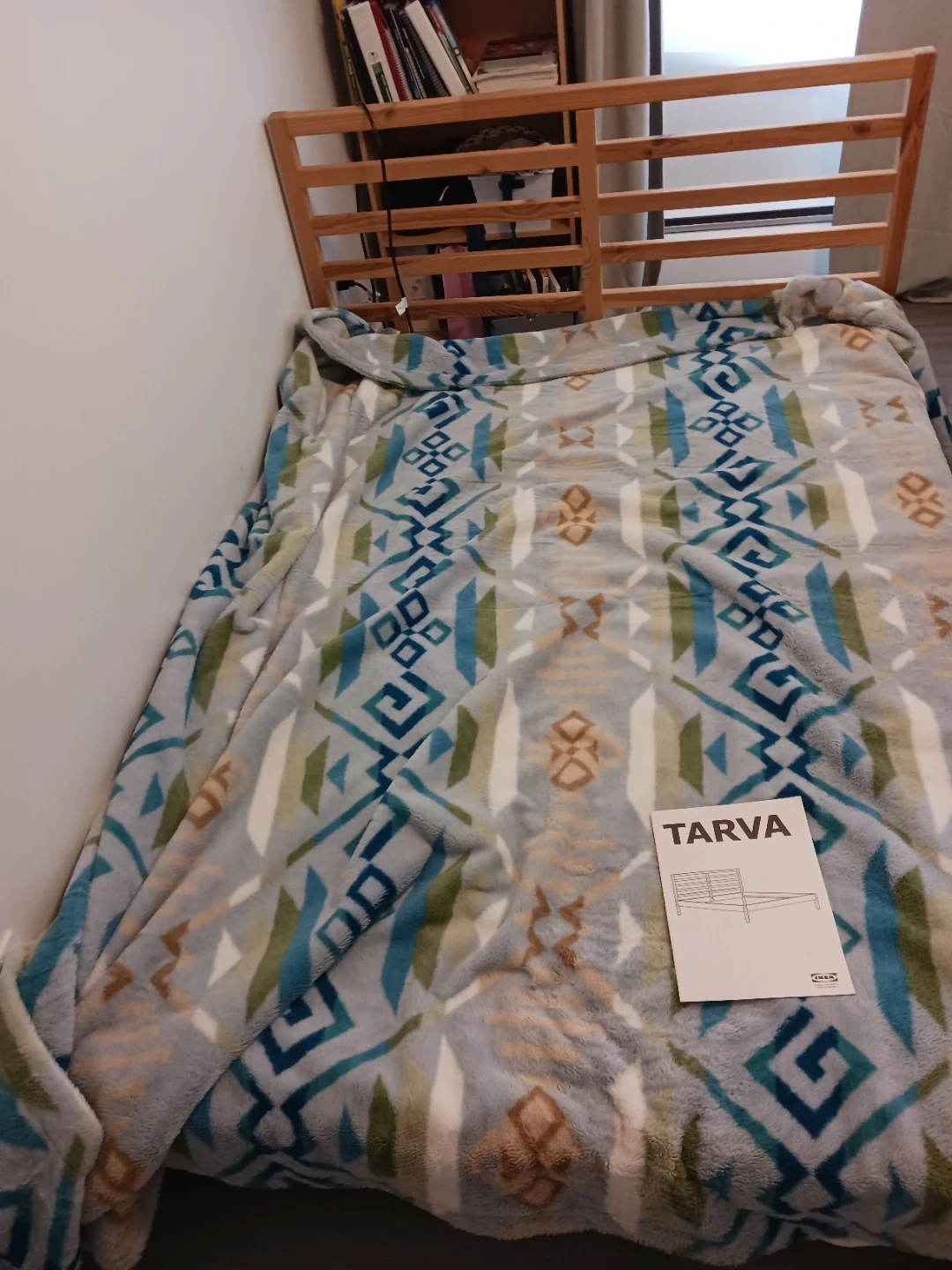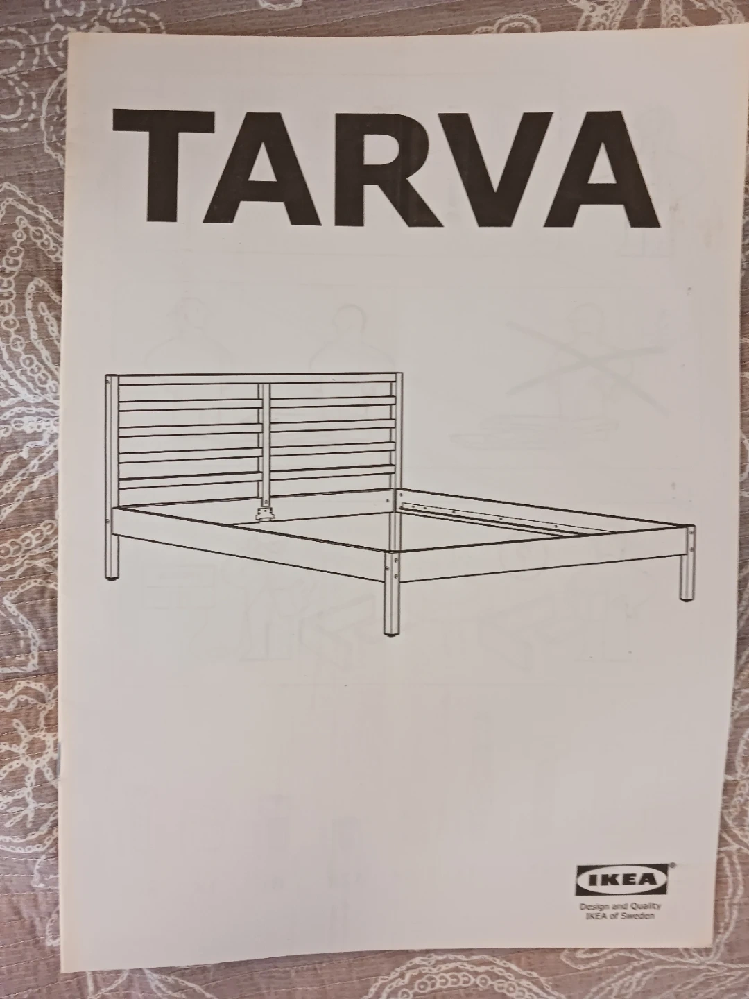 This is an IKEA TARVA bed frame. It's made of wood. This bed frame is a good choice for a minimalist bedroom.