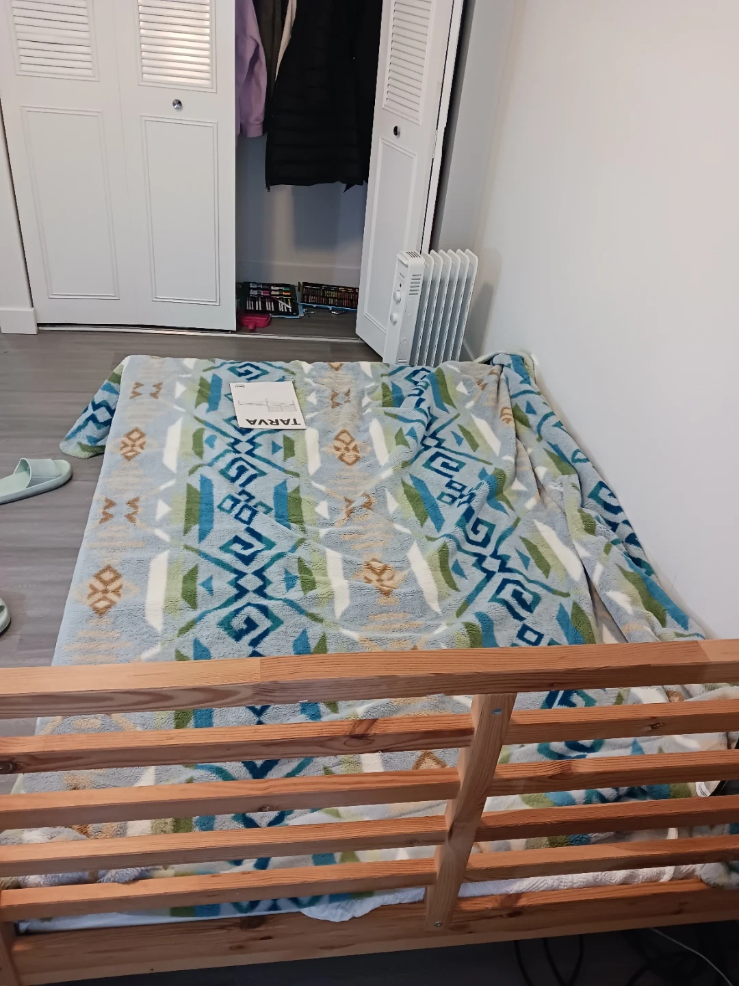 This is an IKEA TARVA bed frame. It's made of wood. This bed frame is a good choice for a minimalist bedroom.