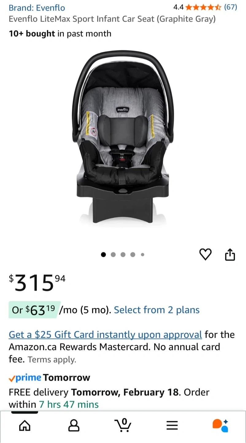 The LiteMax Sport Infant Car Seat is the ideal combination of safety, convenience and value. For infants between 3 - 30 lb in weight and 15.7 – 32 inches in height, the rear-facing Litemax Sport provides the peace of mind you’re looking for in a car seat. The seat is designed with your lifestyle in mind. Weighing less than 9 lb and featuring an ergonomic handle, carrying the LiteMax is easy. For your infant, the seat’s canopy will help protect from the sun, wind and rain. The LiteMax Sport Infant Car Seat meets or exceeds all applicable federal safety standards. In addition to federally required testing, it is structural integrity tested, rollover tested and temperature tested. Families have trusted Evenflo for more than 100 years for smart, innovative gear designed to make life easier, safer and more comfortable at home and on the go. Save time and find peace of mind, so you can focus on what matters most: your child. Technology, and convenient features that help them enjoy the journey of parenthood.