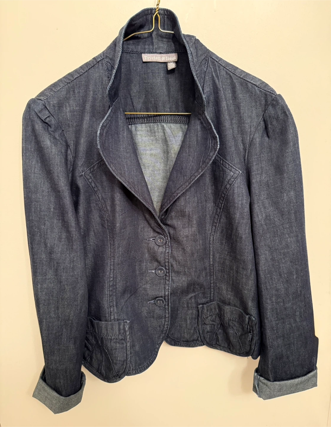 A stylish Tristan & Isolde denim blazer. Features a notched collar and button-up front. A nice layering piece for your wardrobe! This is a softer and lighter jean material.