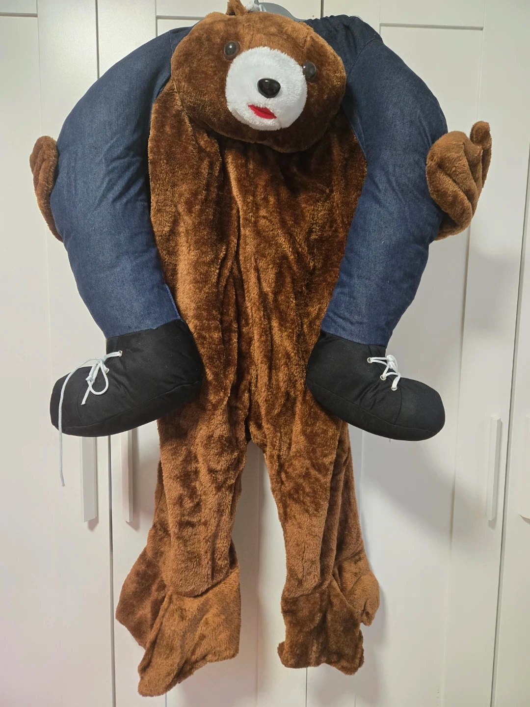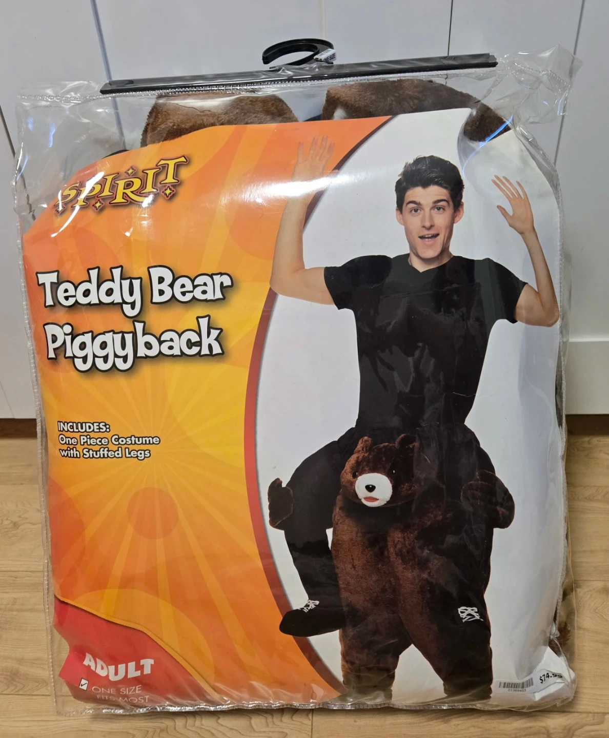 This Spirit brand Teddy Bear Piggyback costume is designed for adults and fits one size most. It's a one-piece costume with stuffed legs. Perfect for Halloween or costume parties!