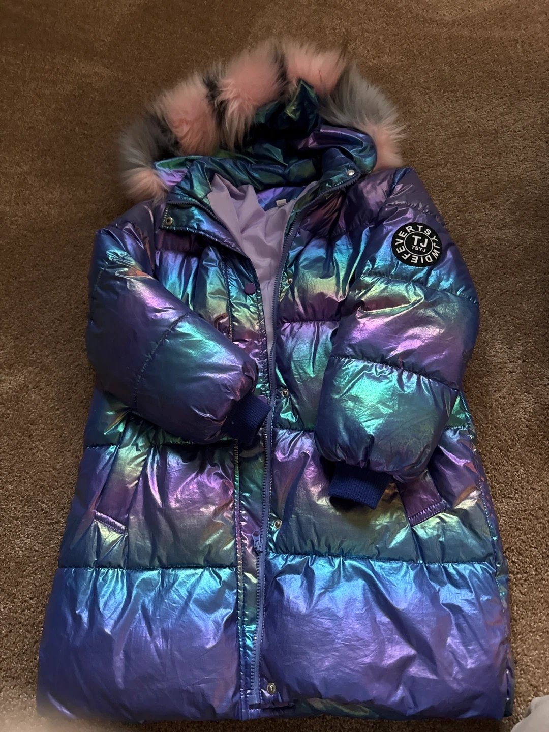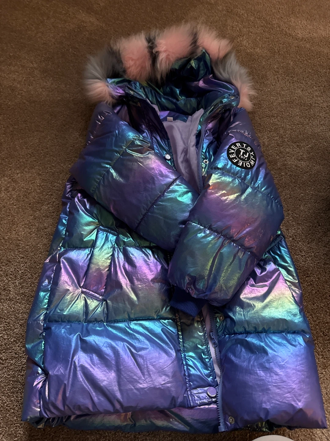 Shiny iridescent puffer coat with faux fur trim on the hood. It's a long-style jacket with ribbed cuffs. Purple and blue colour-shifting exterior.