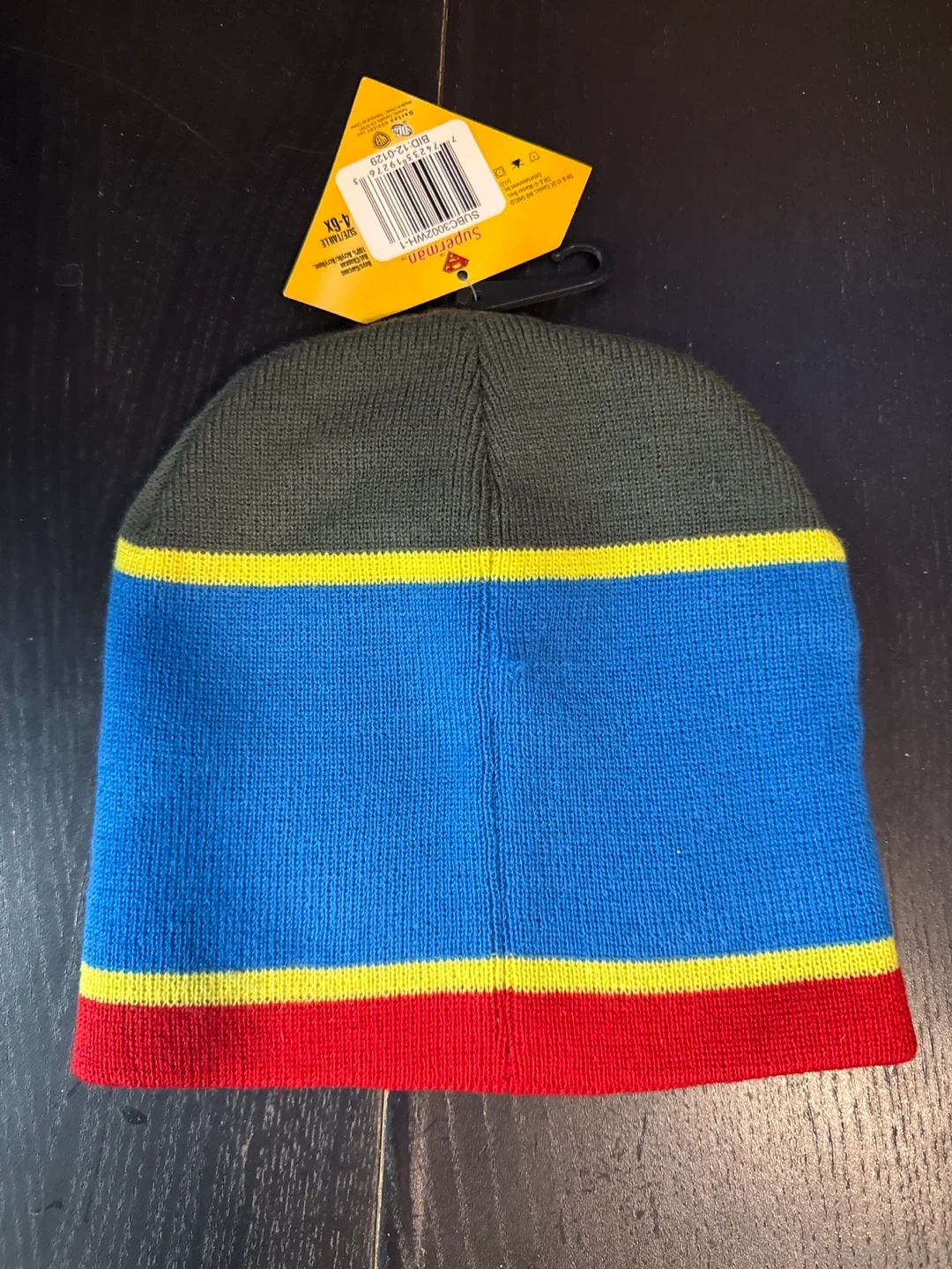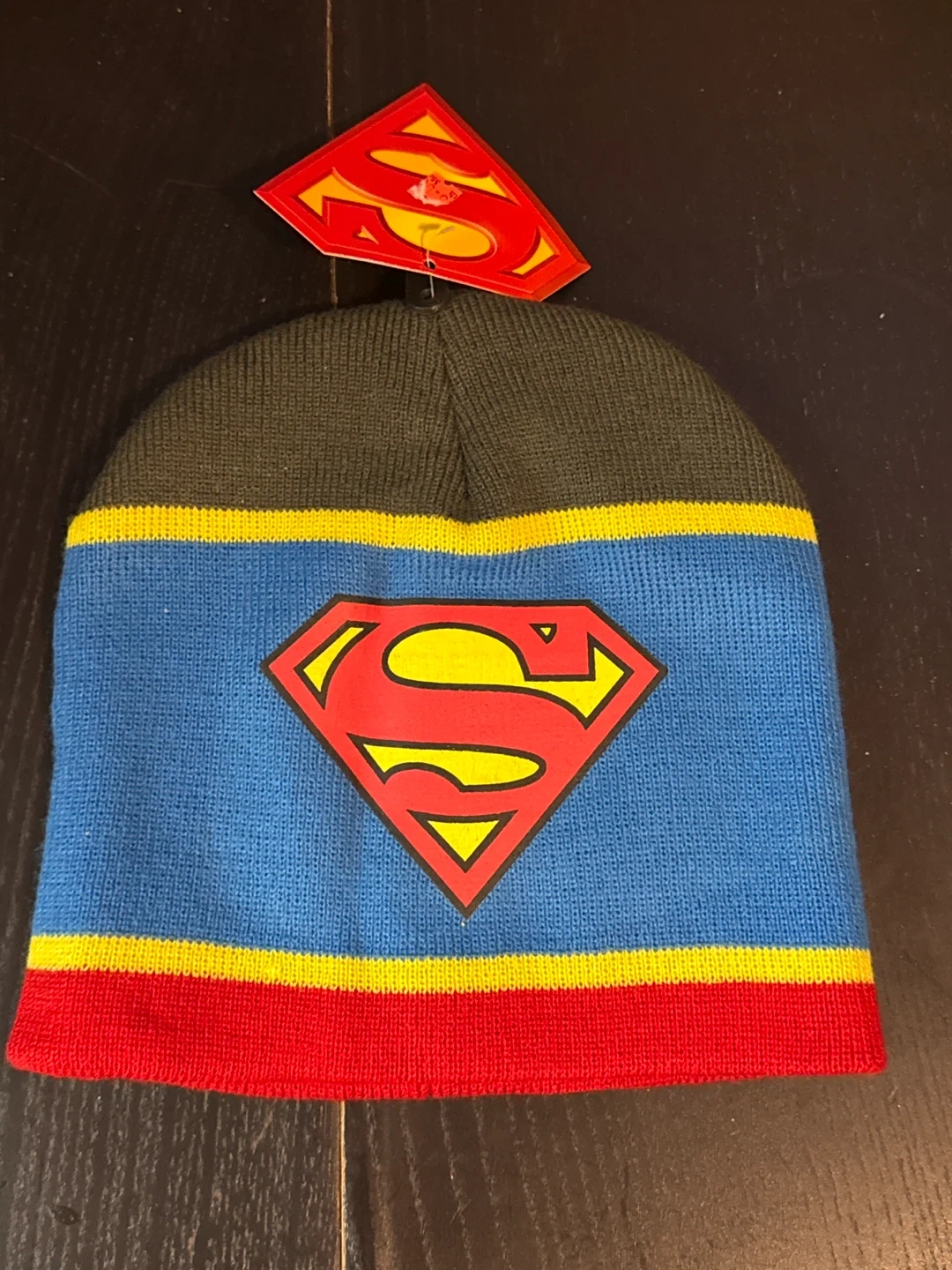 This knit beanie features the classic Superman logo. It's a colourful hat with blue, red, yellow, and dark green sections. One size fits most.