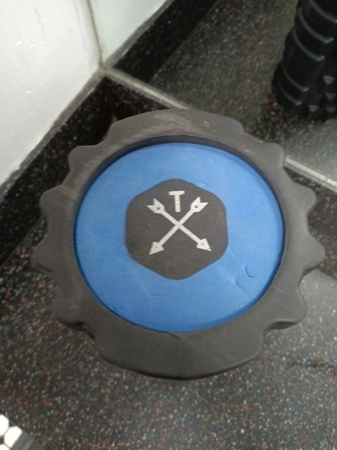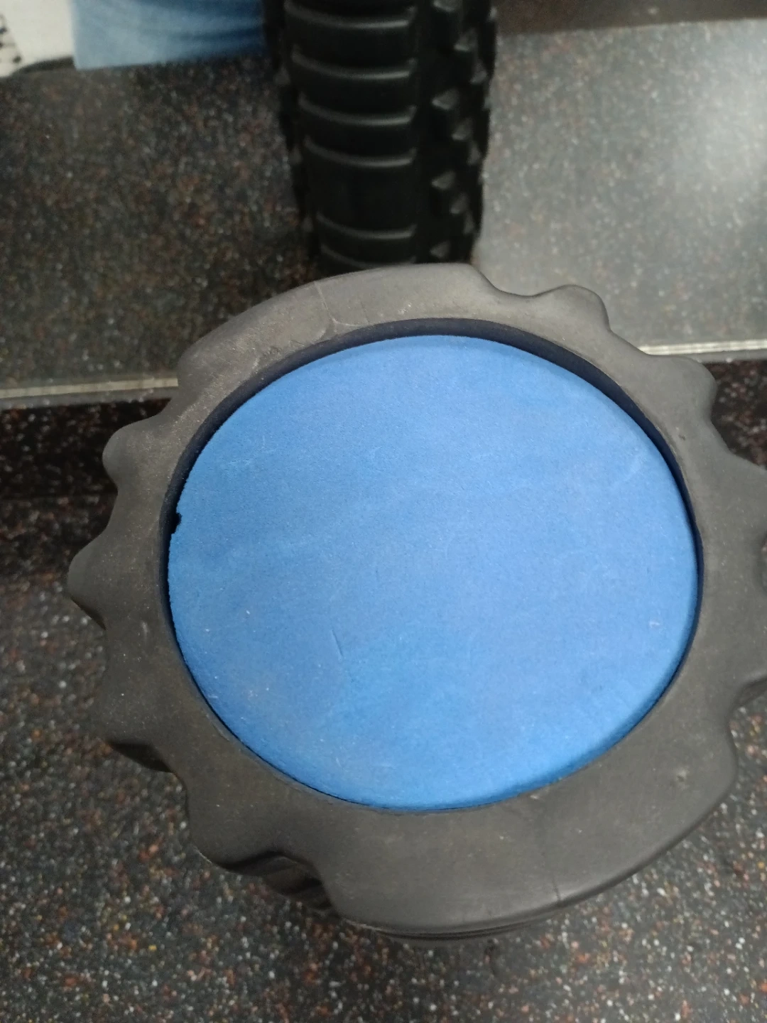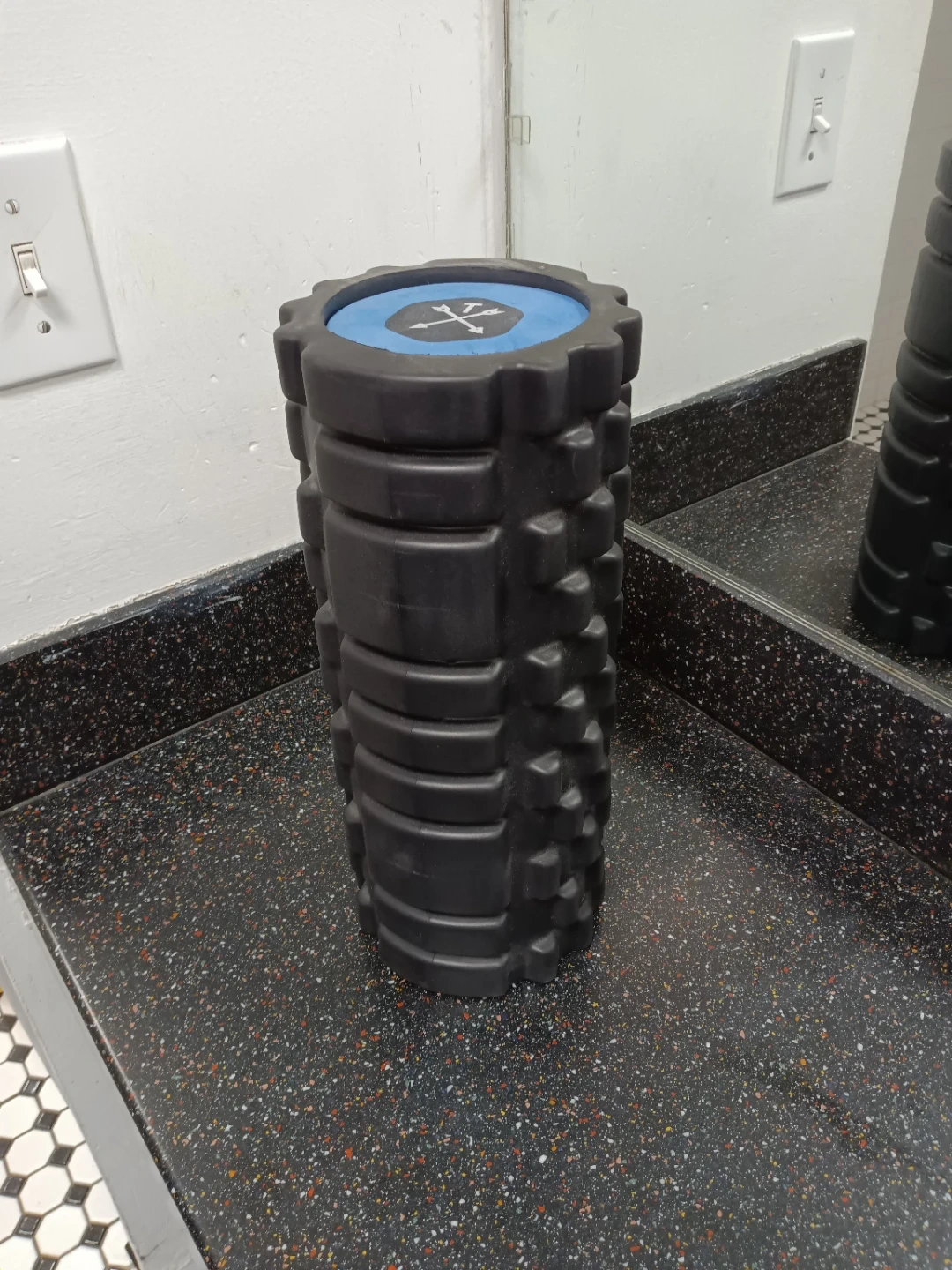 This foam roller has a textured surface for deep tissue massage. It's made of durable material and features a blue end cap with a logo. Great for muscle recovery!
