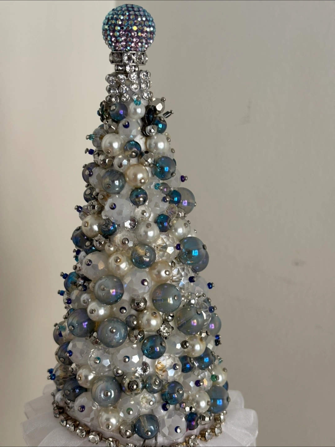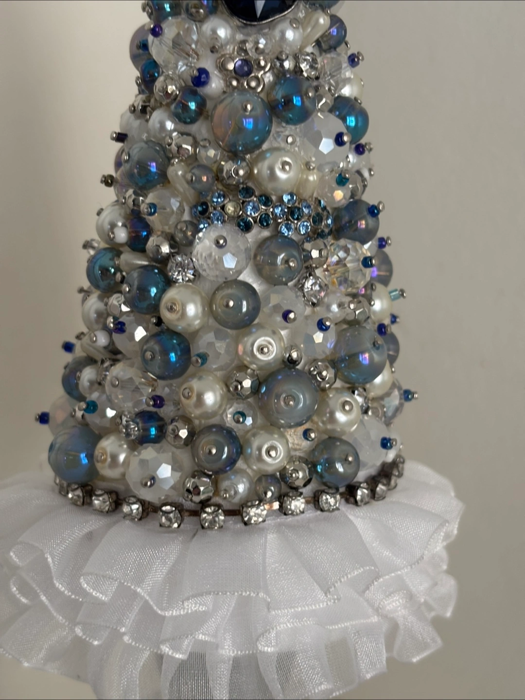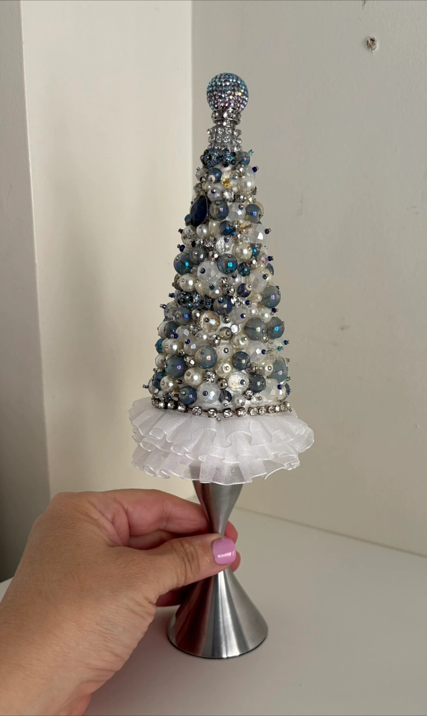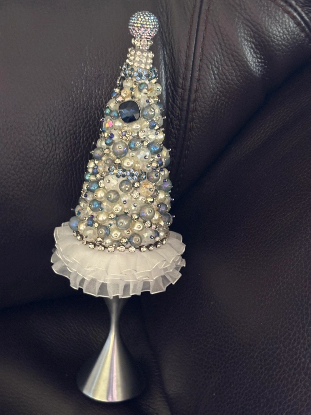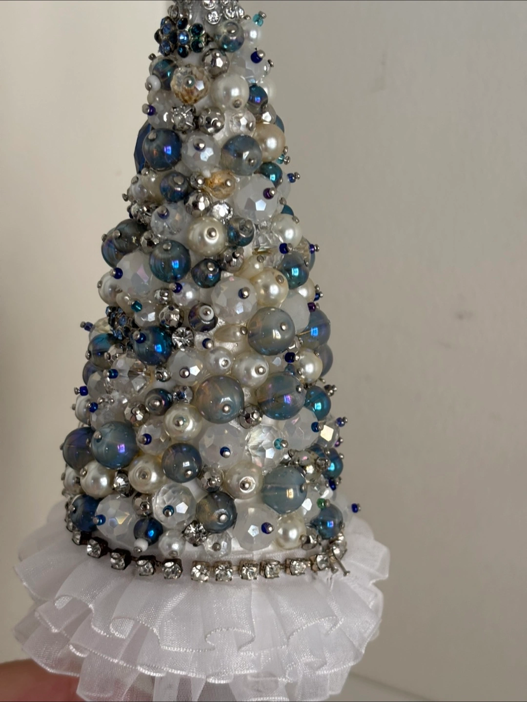 Unique Christmas tree. Features white and blue beads, rhinestones, and a ruffled white fabric base. Metal stand. Perfect for tabletop decor. 10.5” tall , see my other listing Pet and smoke free home Pickup in Mississauga with cash only