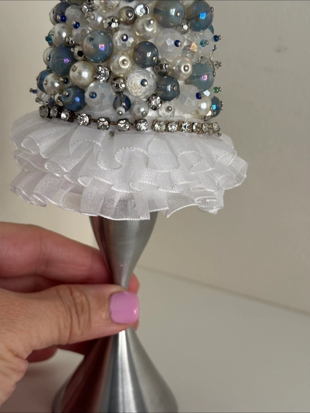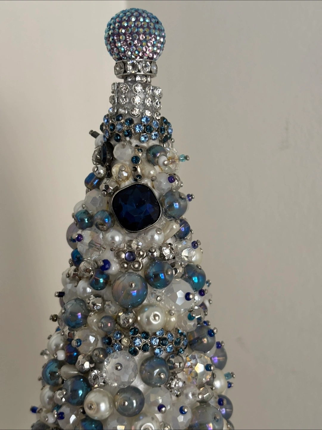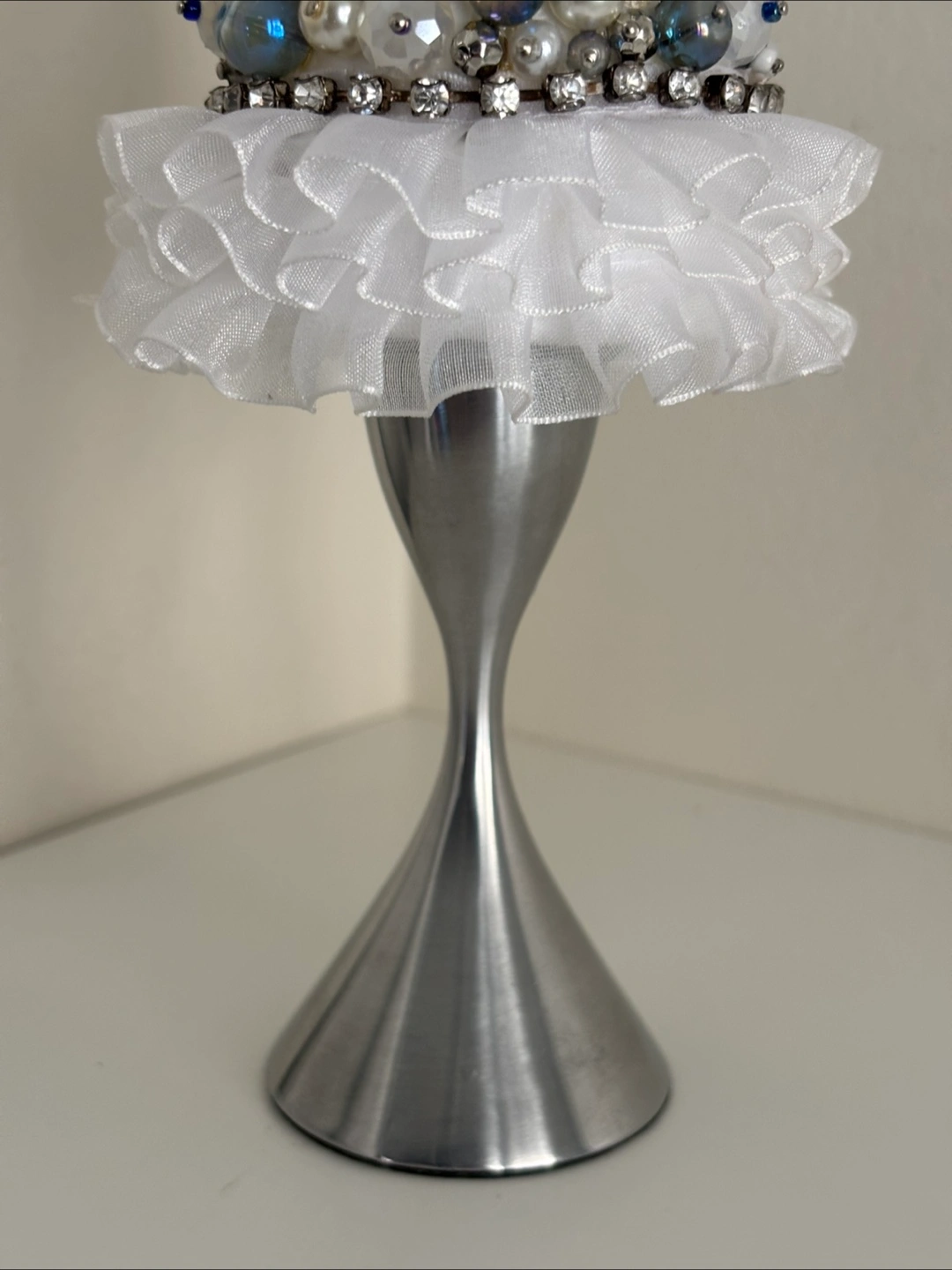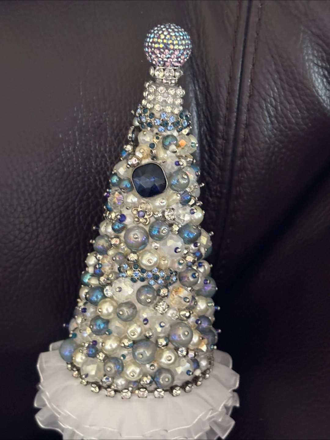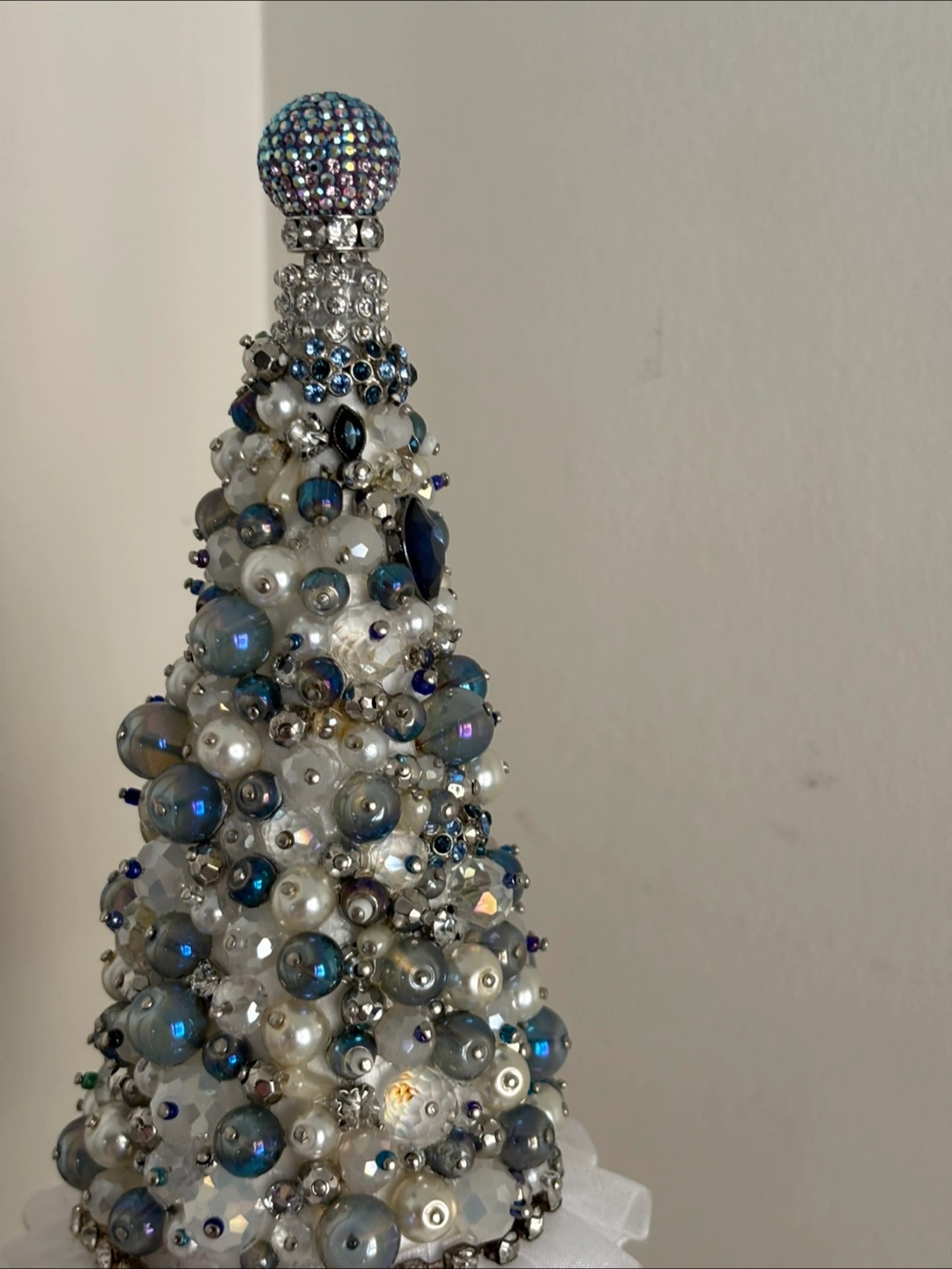 Unique Christmas tree. Features white and blue beads, rhinestones, and a ruffled white fabric base. Metal stand. Perfect for tabletop decor. 10.5” tall , see my other listing Pet and smoke free home Pickup in Mississauga with cash only