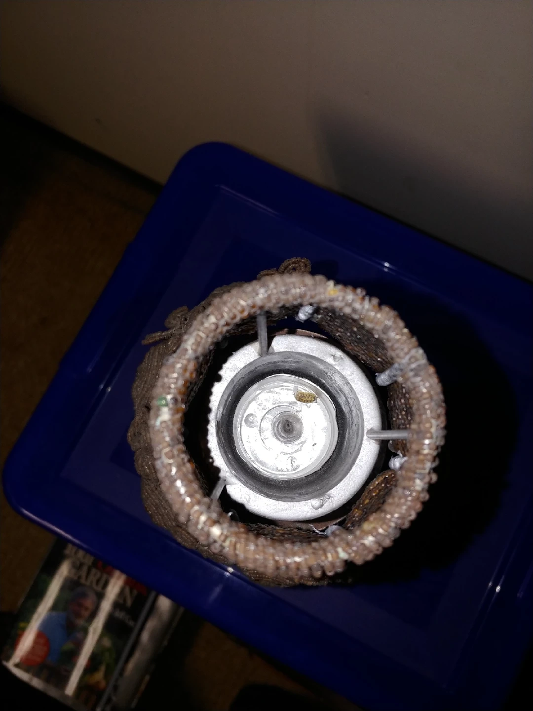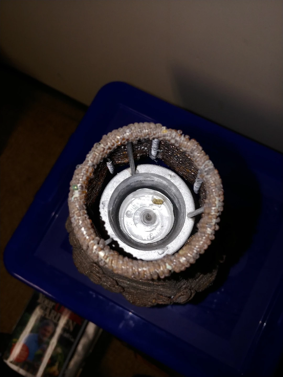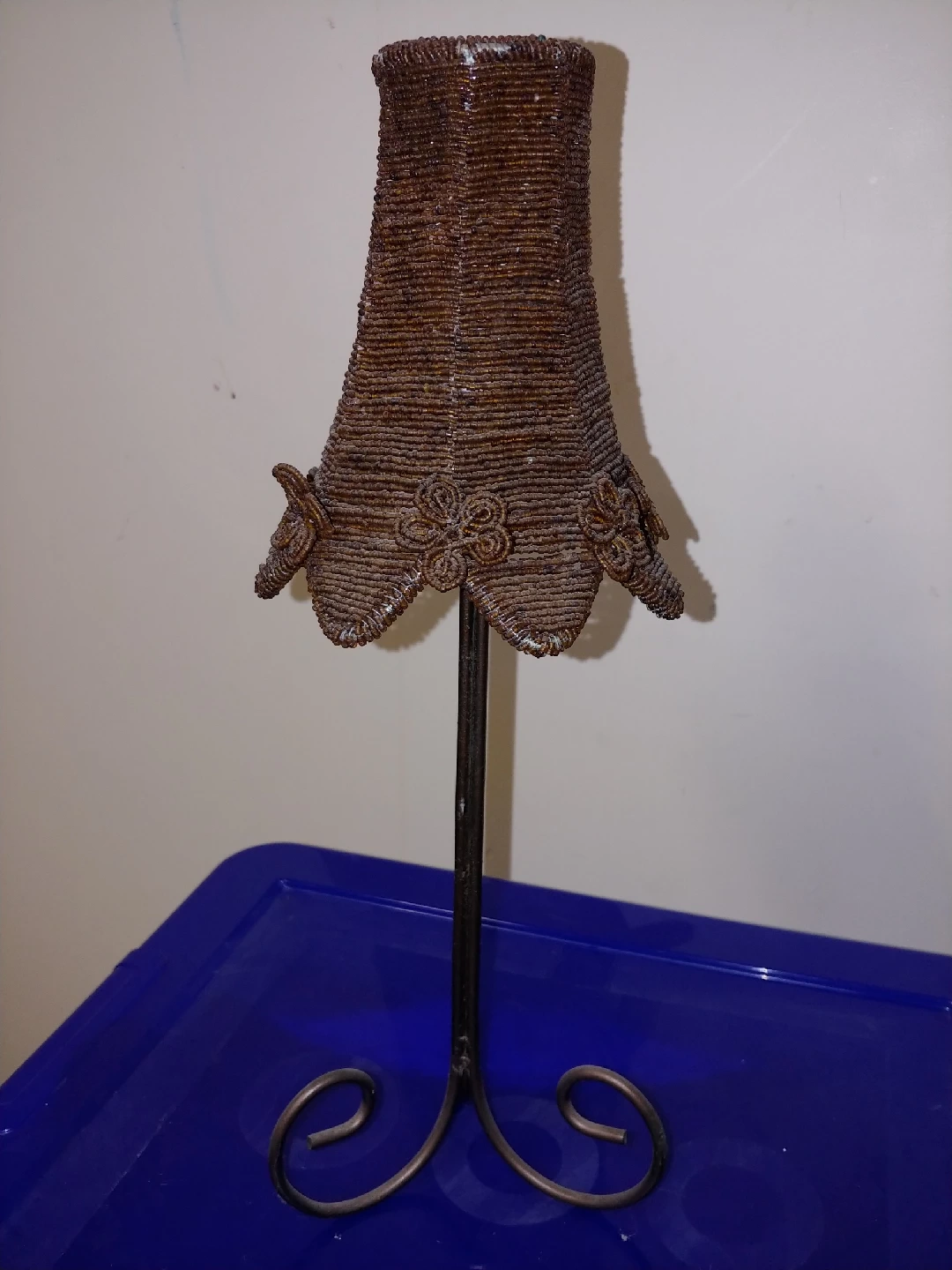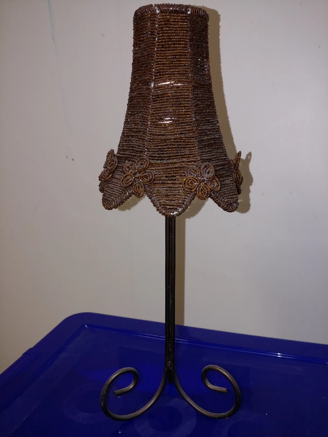 17This is a very unique beaded accent lamp! It has a brown beaded shade with decorative floral accents and a metal stand with a curled base. You would put the candle in the top to illuminate the lamp. It would be a great addition to any room!