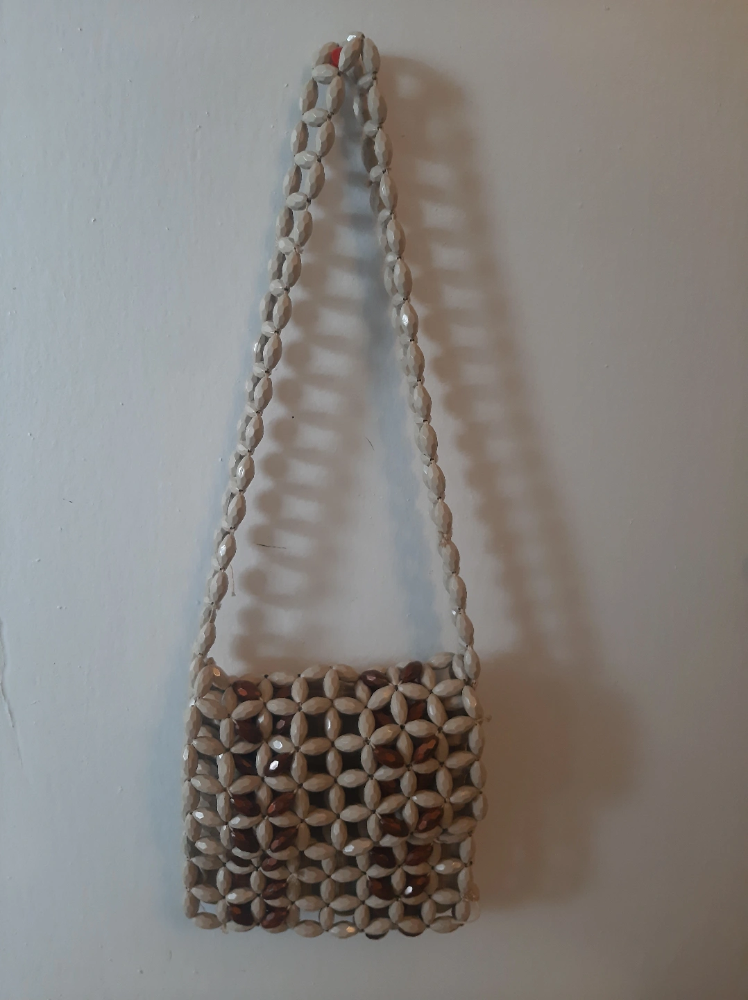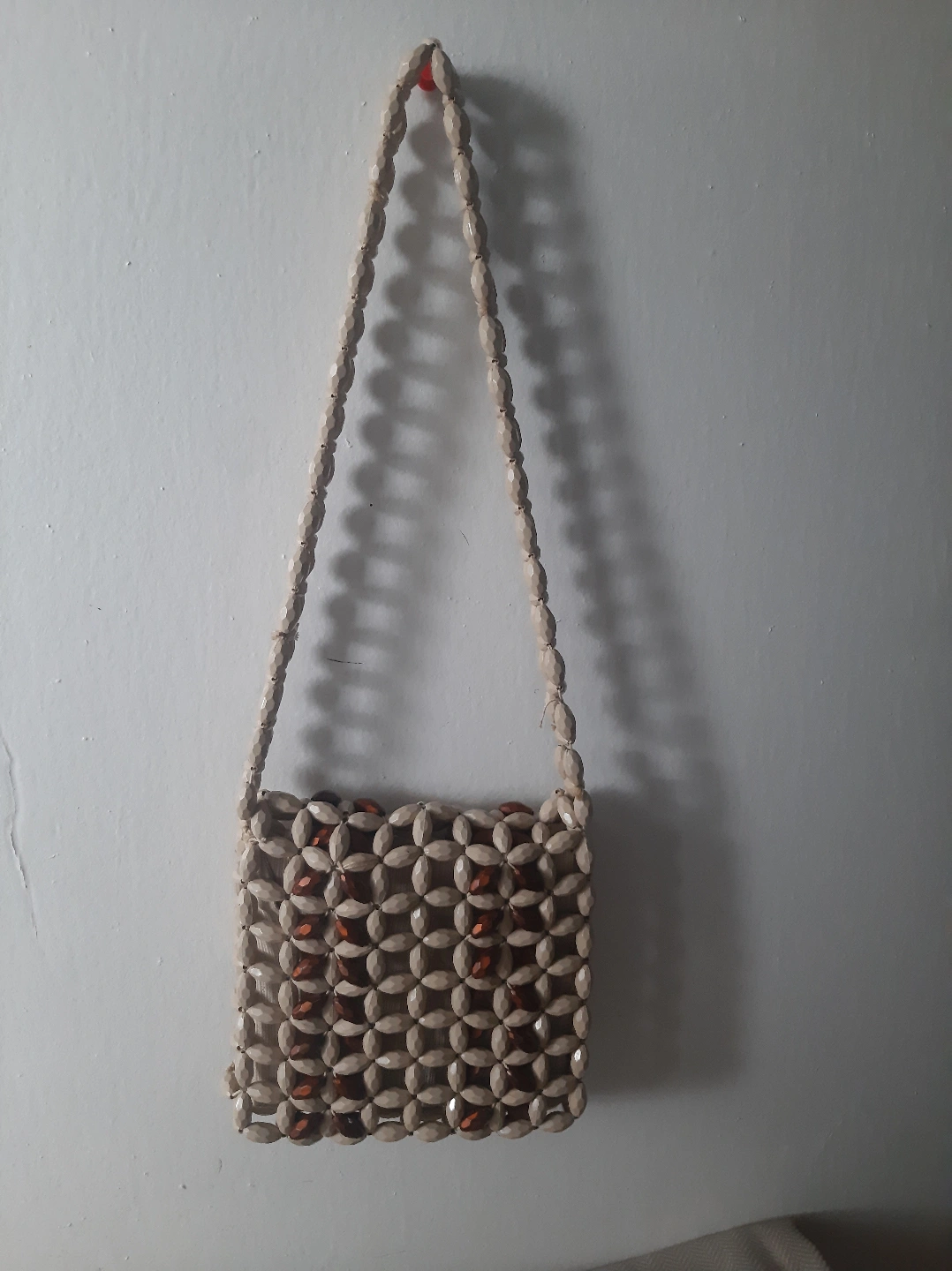 60This stylish beaded shoulder bag is in great condition! It's made in Italy and features a unique design with cream and brown beads. Perfect for adding a touch of elegance to any outfit