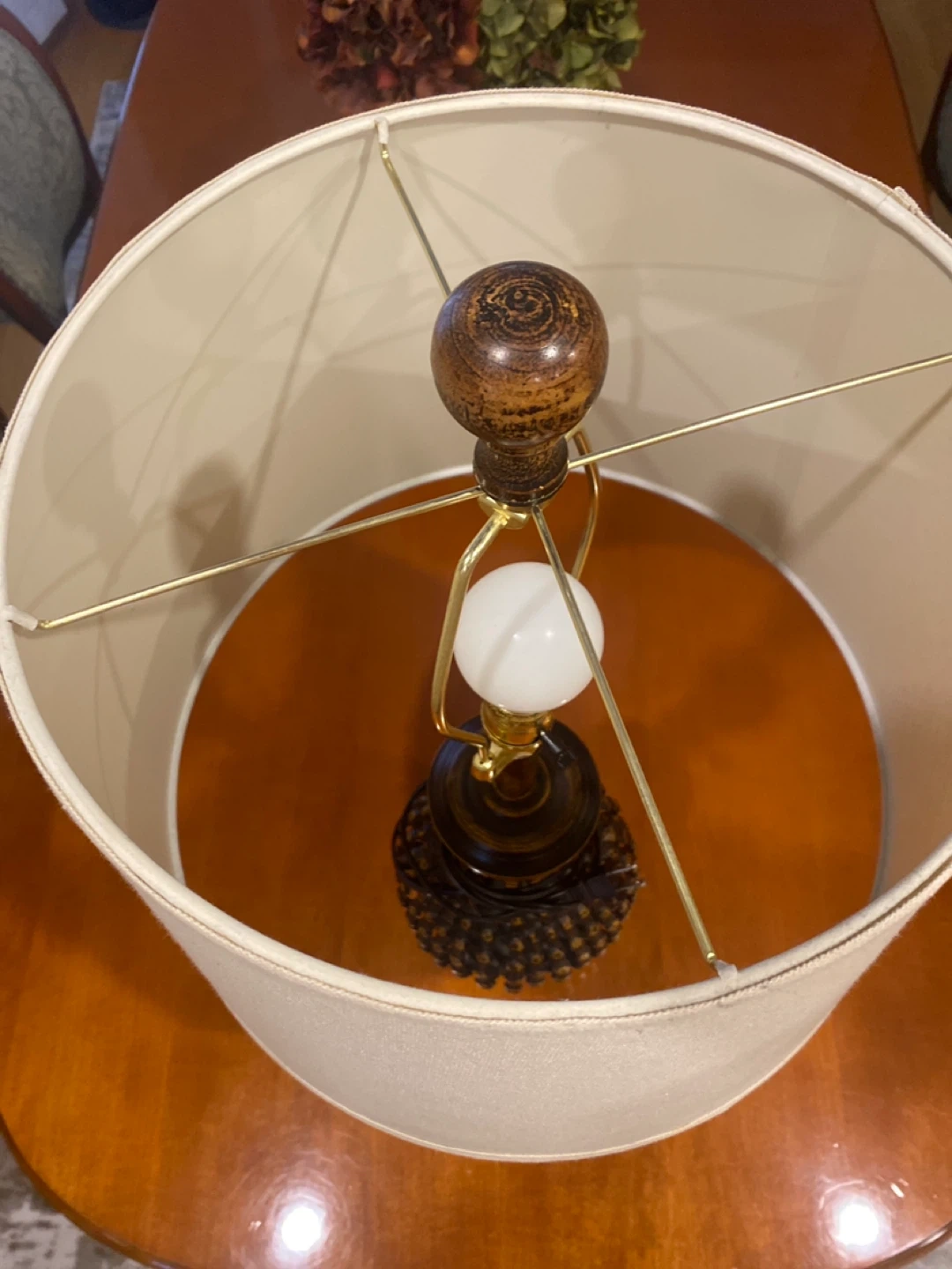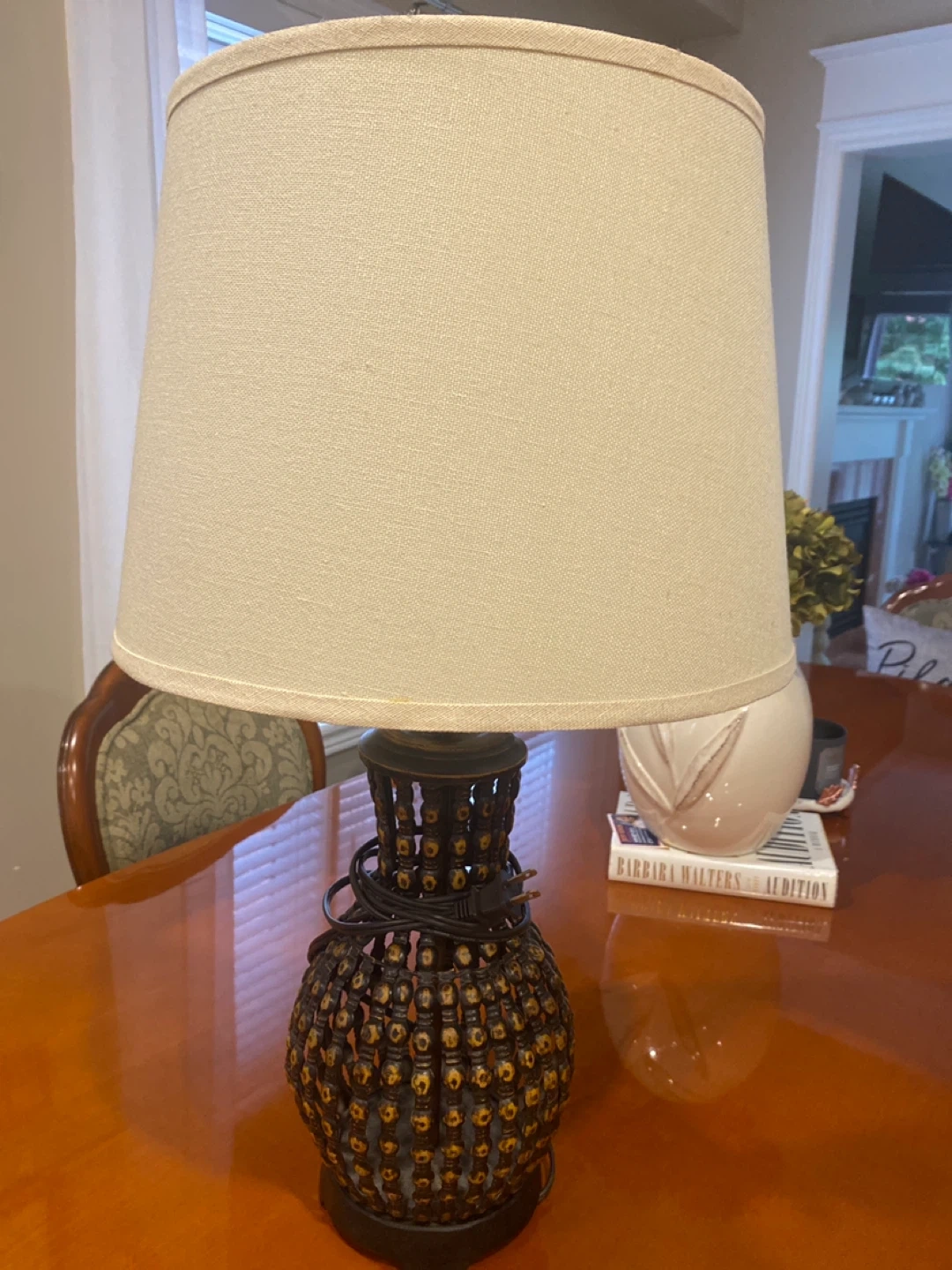 Here's a lovely table lamp with a beaded base and a neutral-coloured shade. It would look great in any room!
