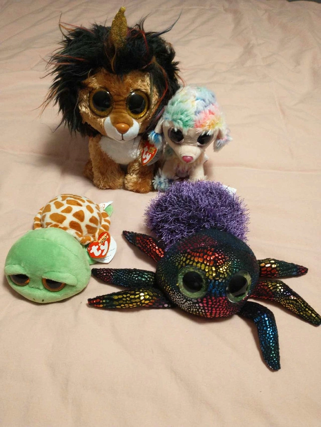 15Some minor imperfections, but no rips or stains. Pick up near Banwell and the Expressway. All for $10 -or see below for pricing: ty - lion with horn - Ramsey, birthday Aug 16 ($4) ty - multicolour poodle (no red tag) ($3) ty - sea turtle - Zippy, birthday May 6 ($5) Multicolour spider - not ty($2)