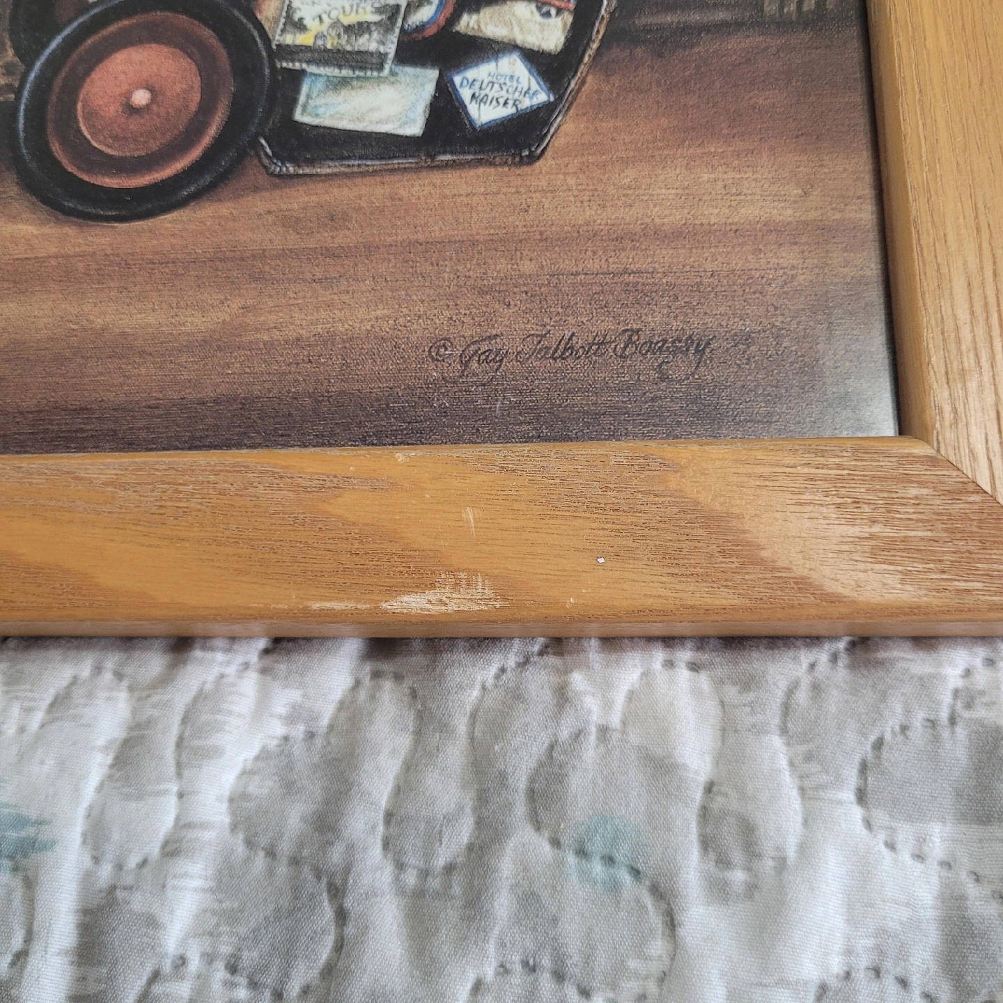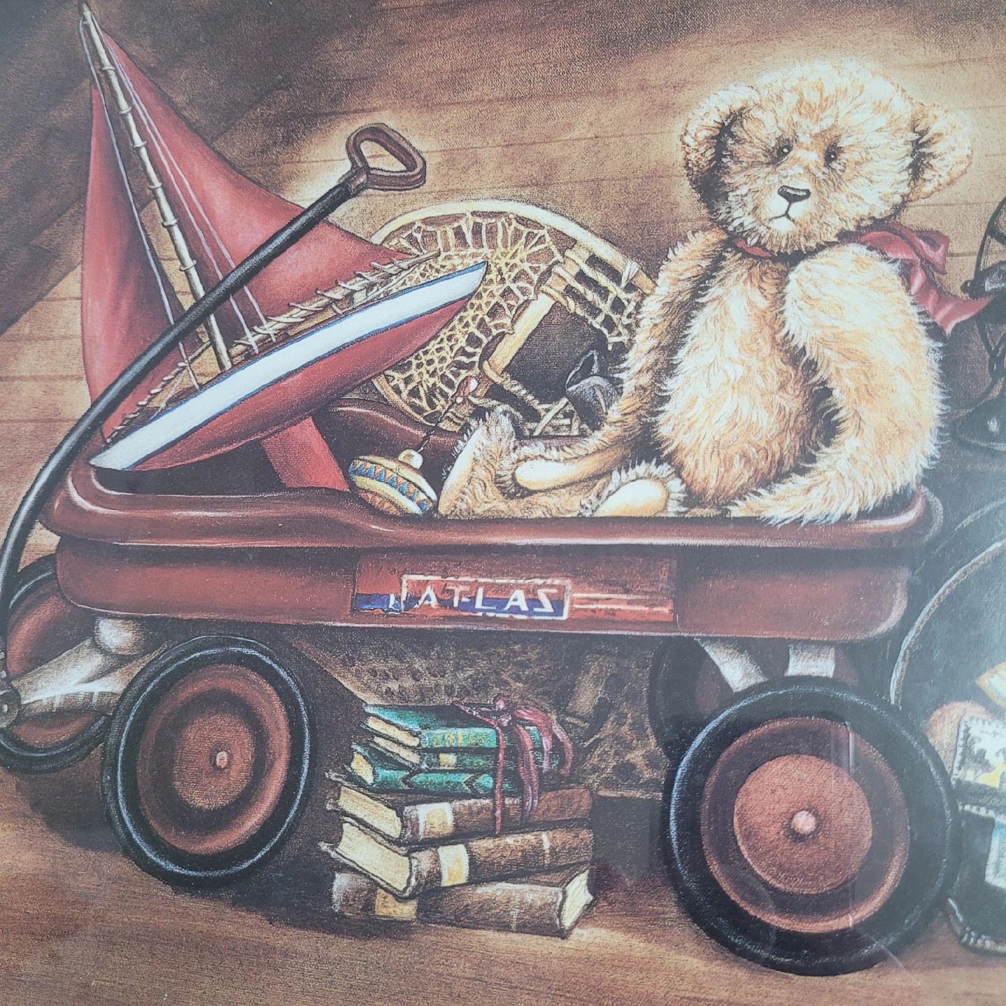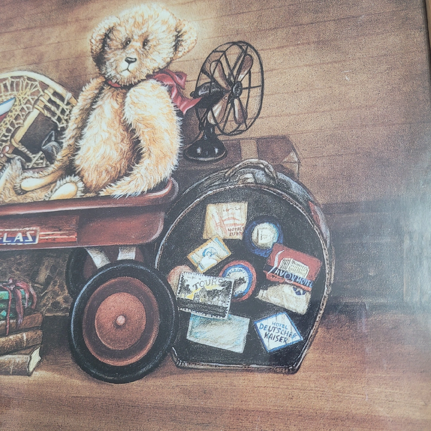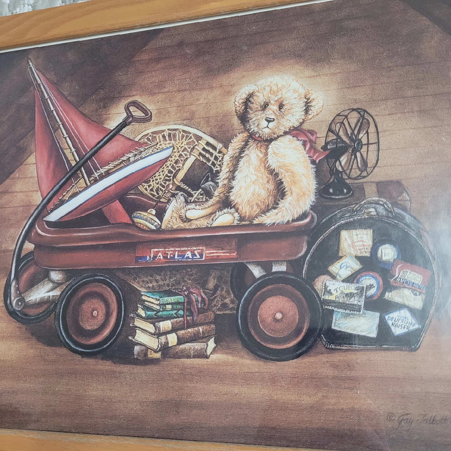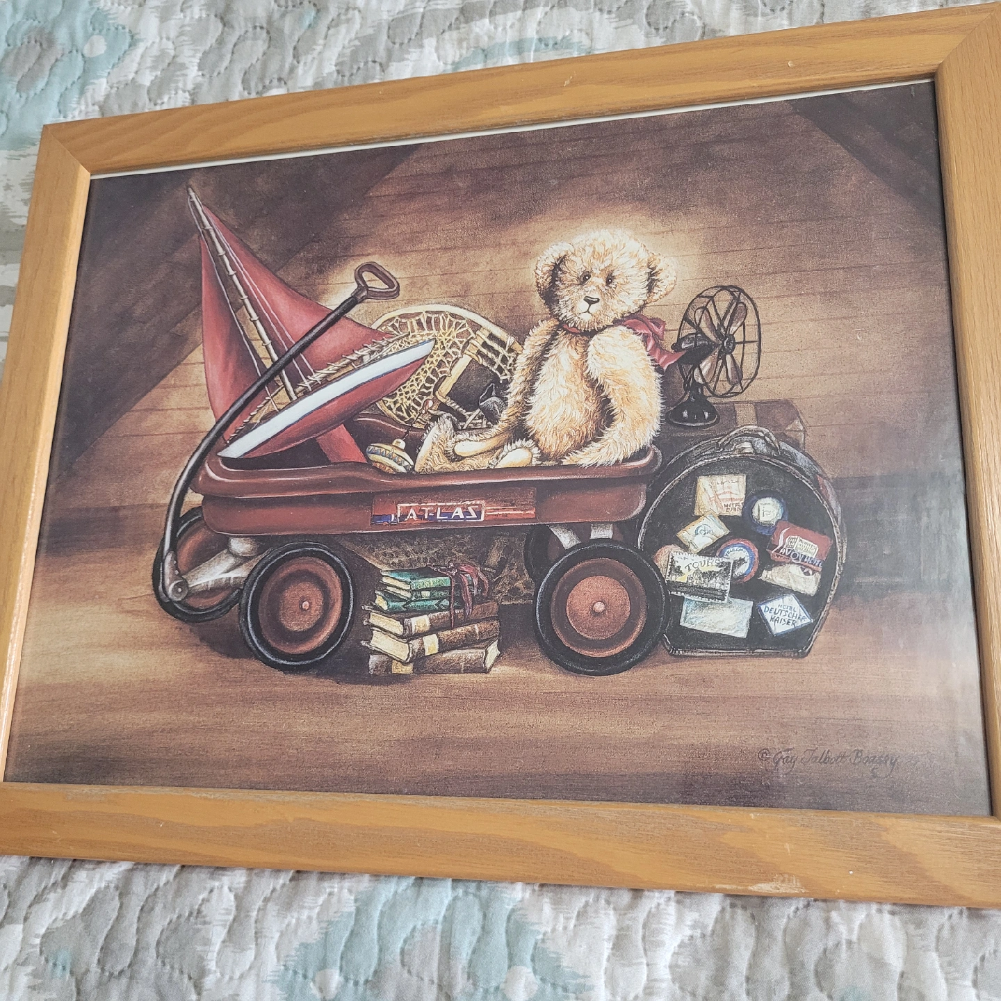 Bear with His Toys Waiting In The Attic Painting By Gay Talbott-Boassy Not in original frame 18" x14" total Framed Little Scuff bottom right of Frame Please See all my Other Listings, Bundle & Save for a Better Deal! Located in Bradford, May be able to Meet, Shipping Offered at Buyers Expense, Please contact me for more Info & to make arrangements, sorry no holds without an ET, Thank you so much for Looking!