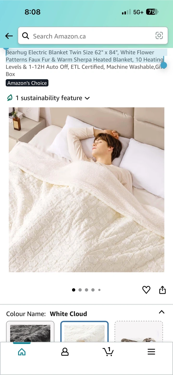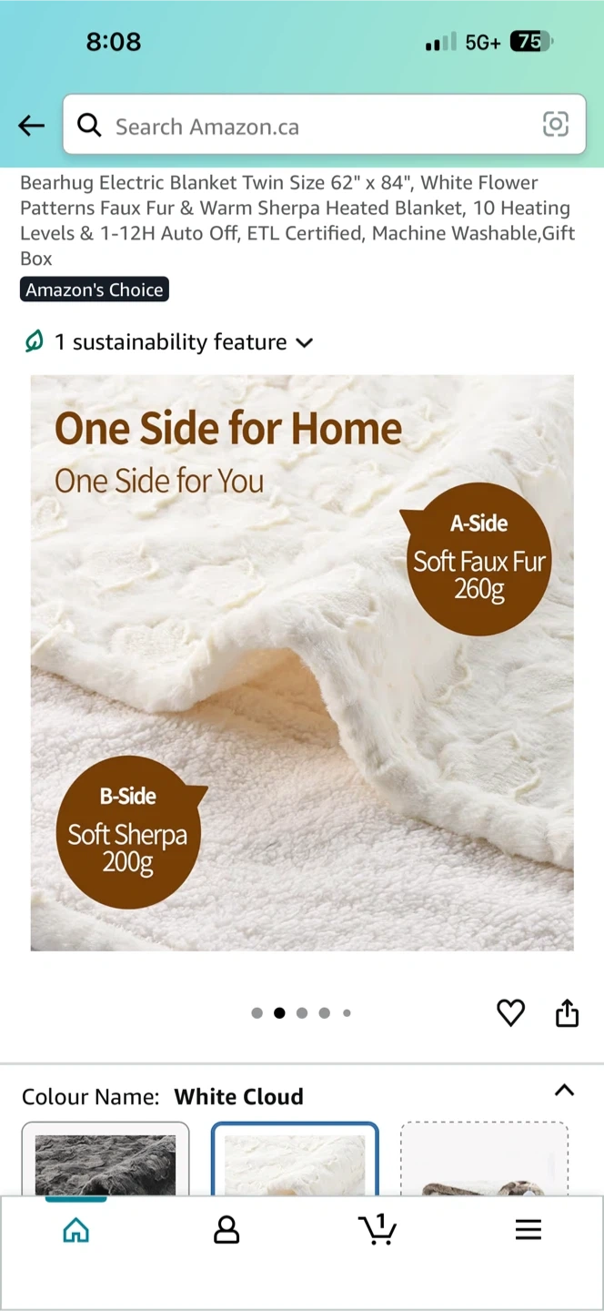 18Cozy up with this Bearhug Electric Blanket! It's a twin size (62" x 84") in the "White Cloud" colour. It has 10 heat settings and is made with Faux Fur and Sherpa material, so it's super soft on both sides. The box is included!
