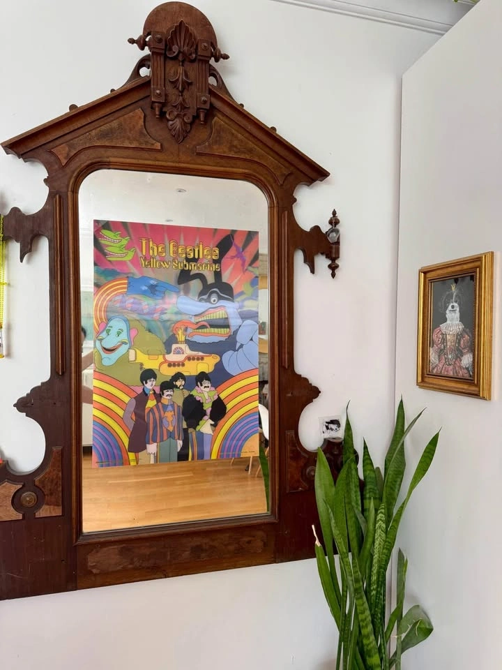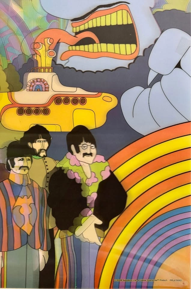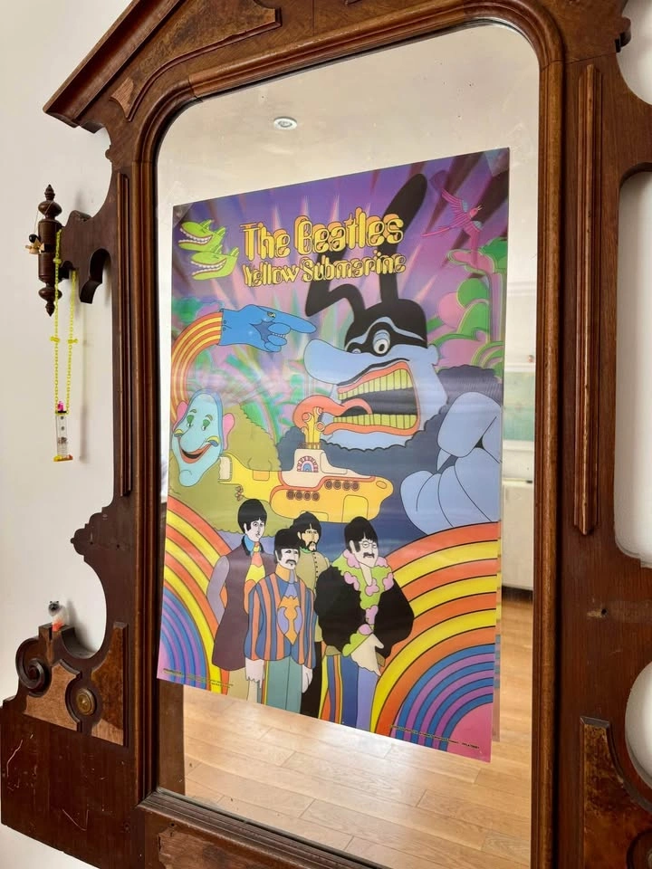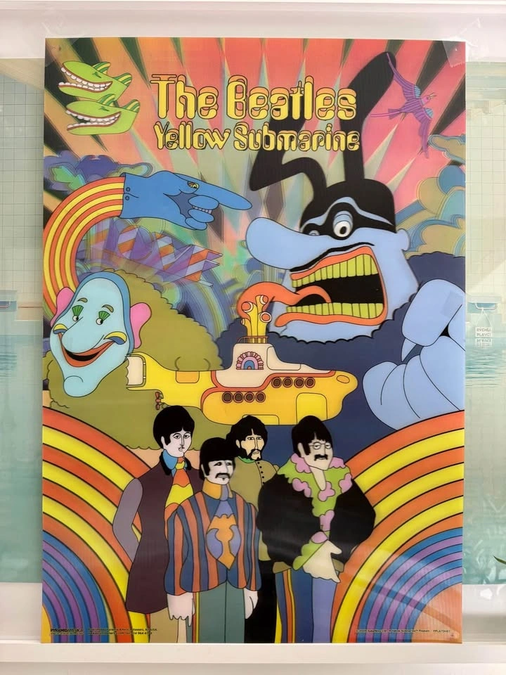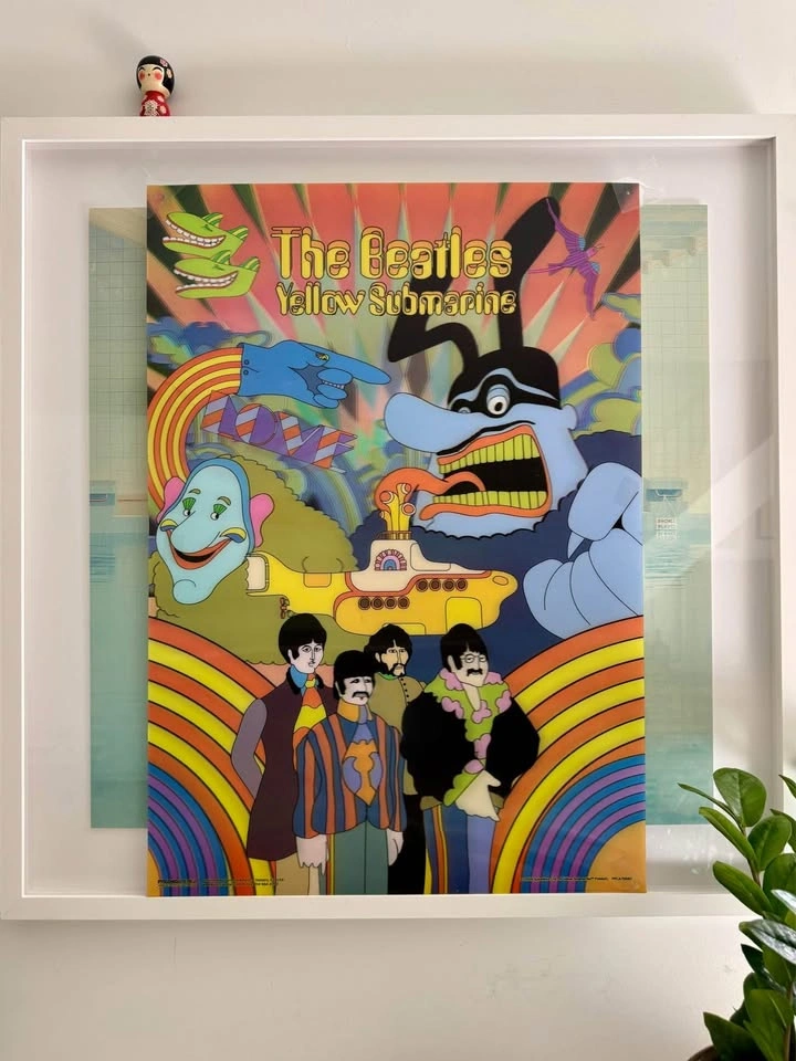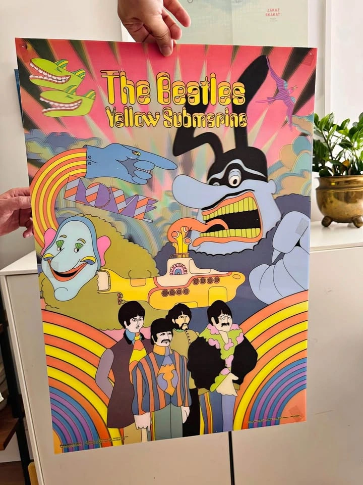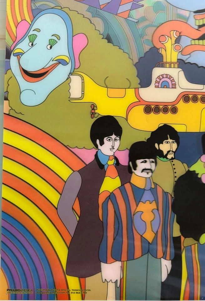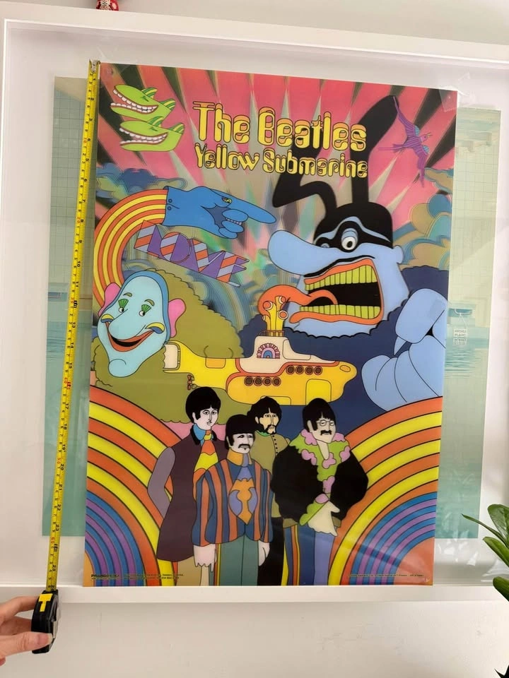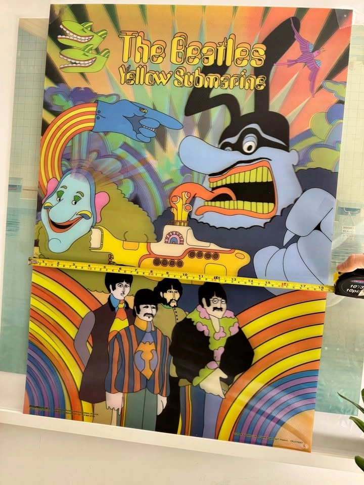 Rare large holographic 3D poster for The Beatles' 1968 animated film "Yellow Submarine". 2009. Published by Pyramid America. 26" (height) x 18” (width). Image moves when tilted or when you move to view it. Really cool psychedelic groovy piece. Porch pick up Christie St and St. Clair West Ave (10 min walk from St. Clair WEST subway station). Toronto. Own a piece of rock and roll history with this Beatles Yellow Submarine 3D large 18” x 26" Lenticular Poster. Featuring the iconic band, this poster is perfect for any music lover and Beatles fan. This collectible poster is perfect for framing and displaying in any room. It's a must-have for any music memorabilia or entertainment memorabilia collector. I tapped it against my large art frame and large mirror for size reference. Poster has a few minor surface scratches but they are hard to see with all the wildness going on!