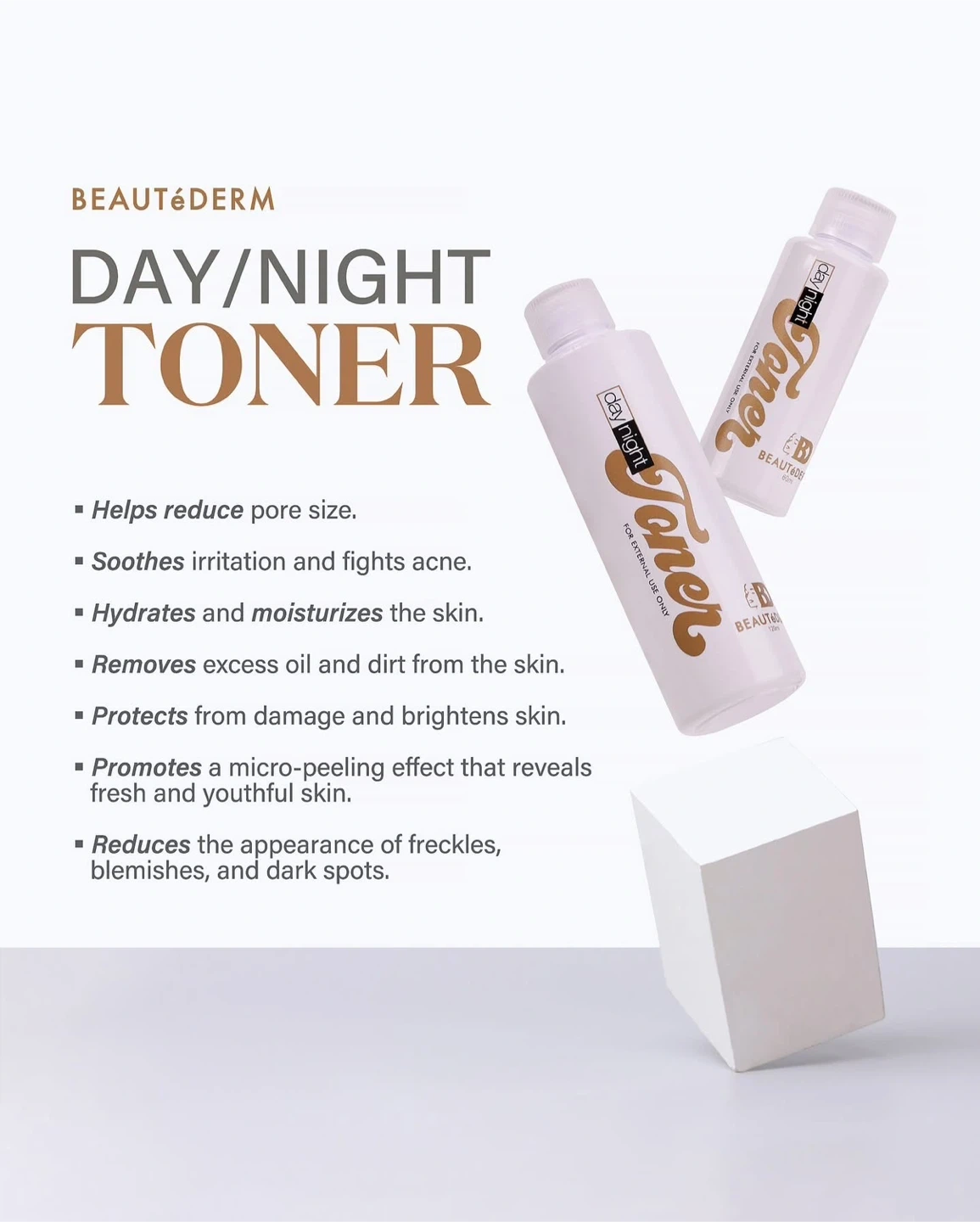 65Selling a bottle of BeautéDerm Day/Night Toner! It helps reduce pore size, soothes irritation and fights acne, and hydrates and moisturizes the skin. It also removes excess oil and dirt, protects from damage, and brightens the skin. This toner promotes a micro-peeling effect for a fresh and youthful skin and reduces the appearance of freckles, blemishes, and dark spots