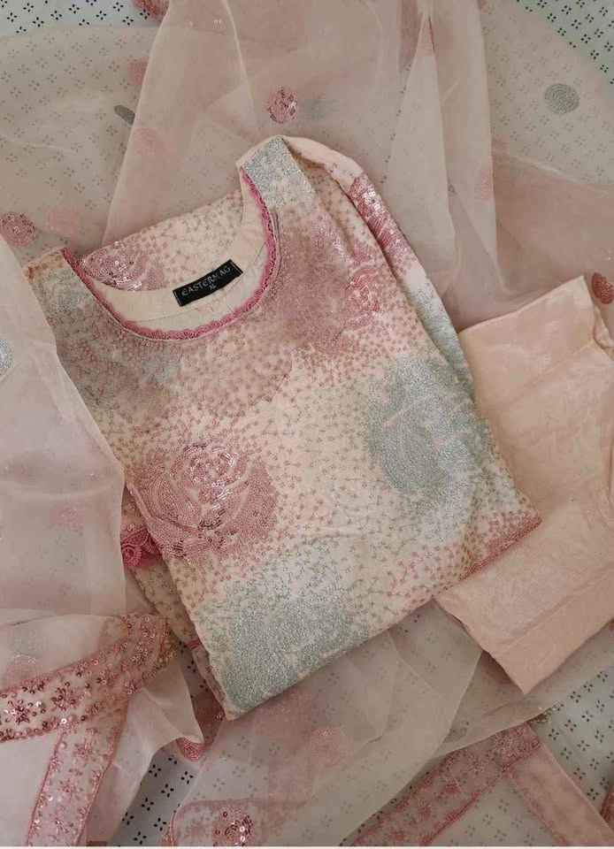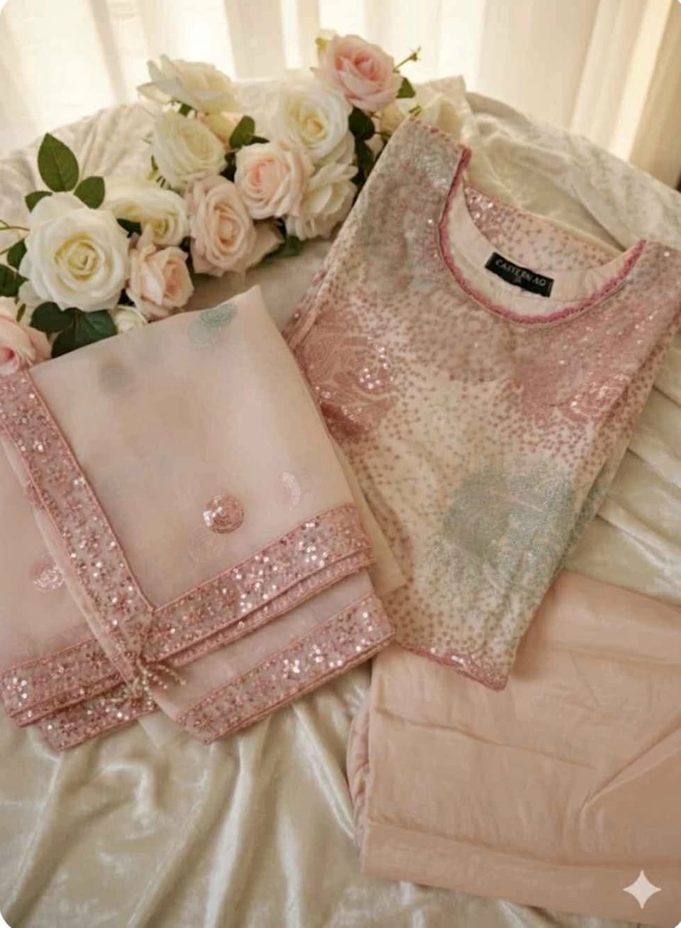 15Beautiful peach colour 3 pcs sequence work suit. Raw silk trousers. Soft organza dupatta. Size Xl ( chest size 25) Brand new Check other listings too Door pick up also available