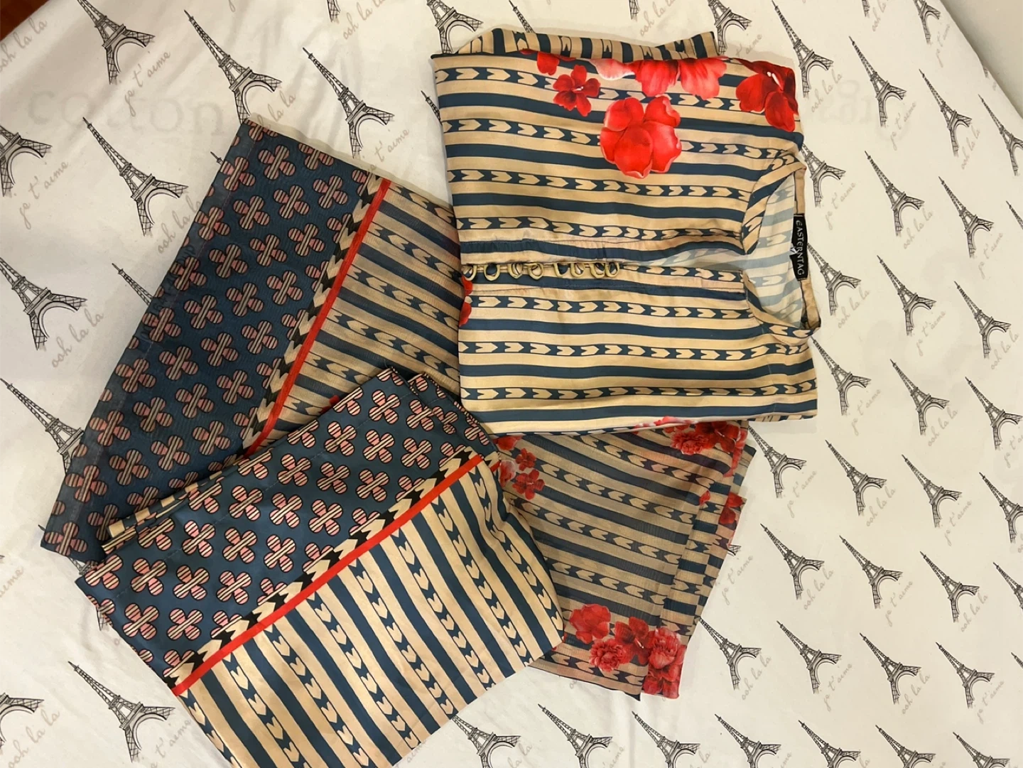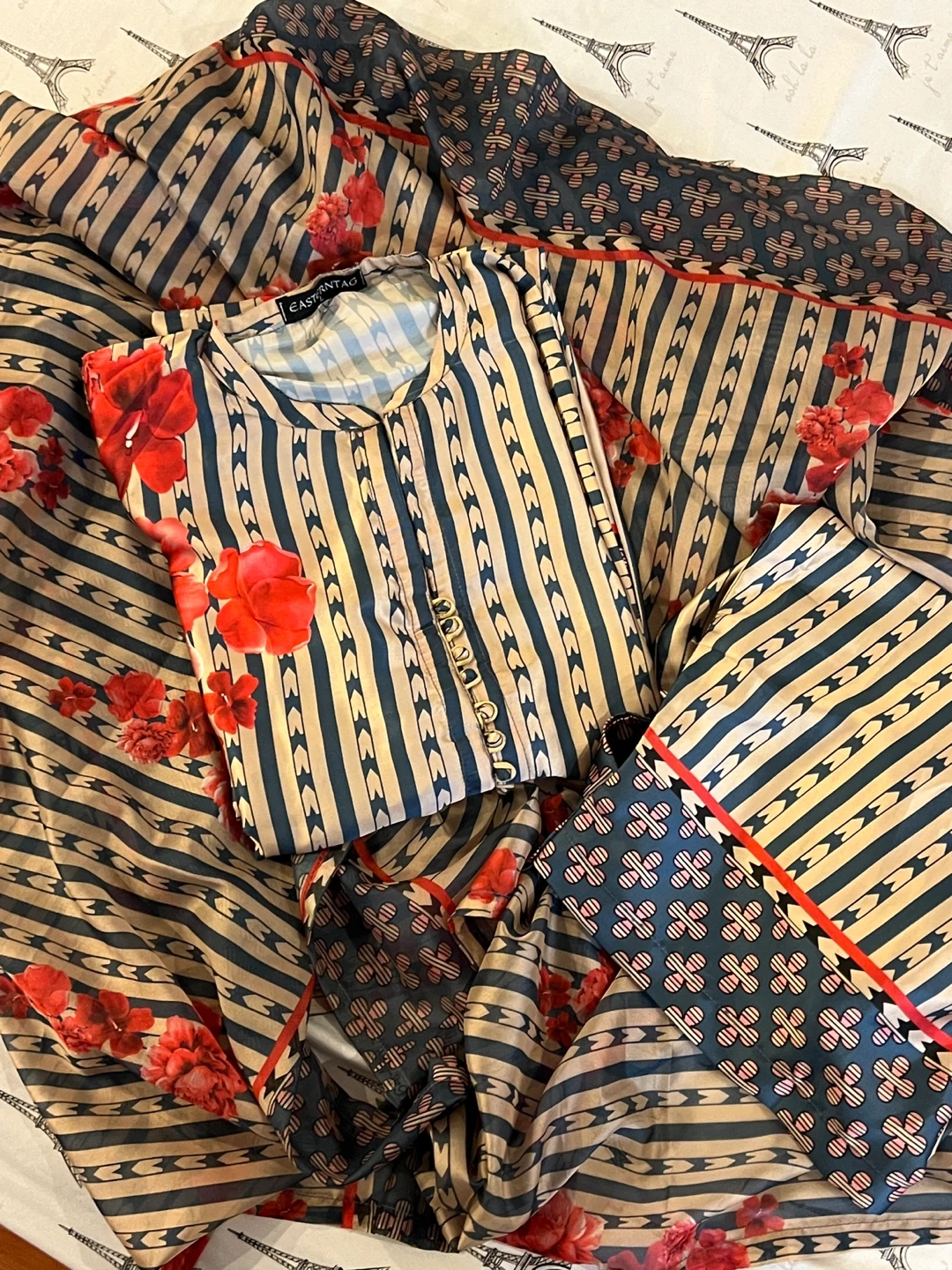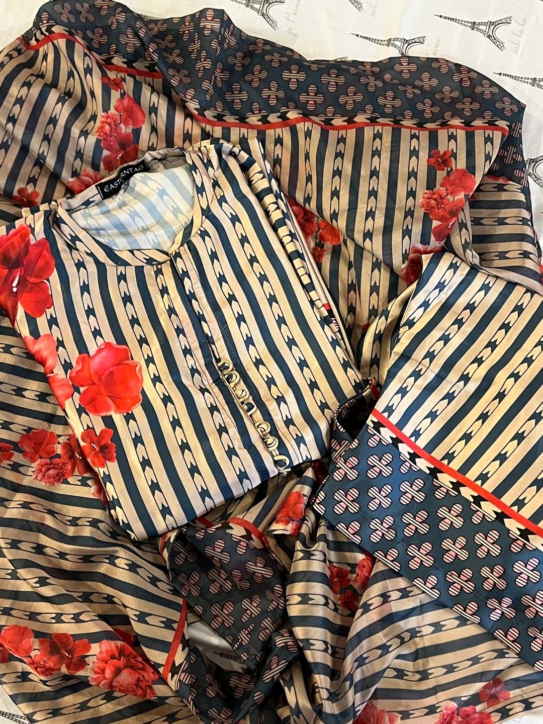 10Beautiful 3Pcs Silk Suit with a unique floral and striped design! It's brand New. The material feels lovely and the colours are vibrant . Comes with shirt trousers and Dupatta Size:Large Price:$55 Order Now Door pickup Available /Shipment also Available Check out our other listings as well